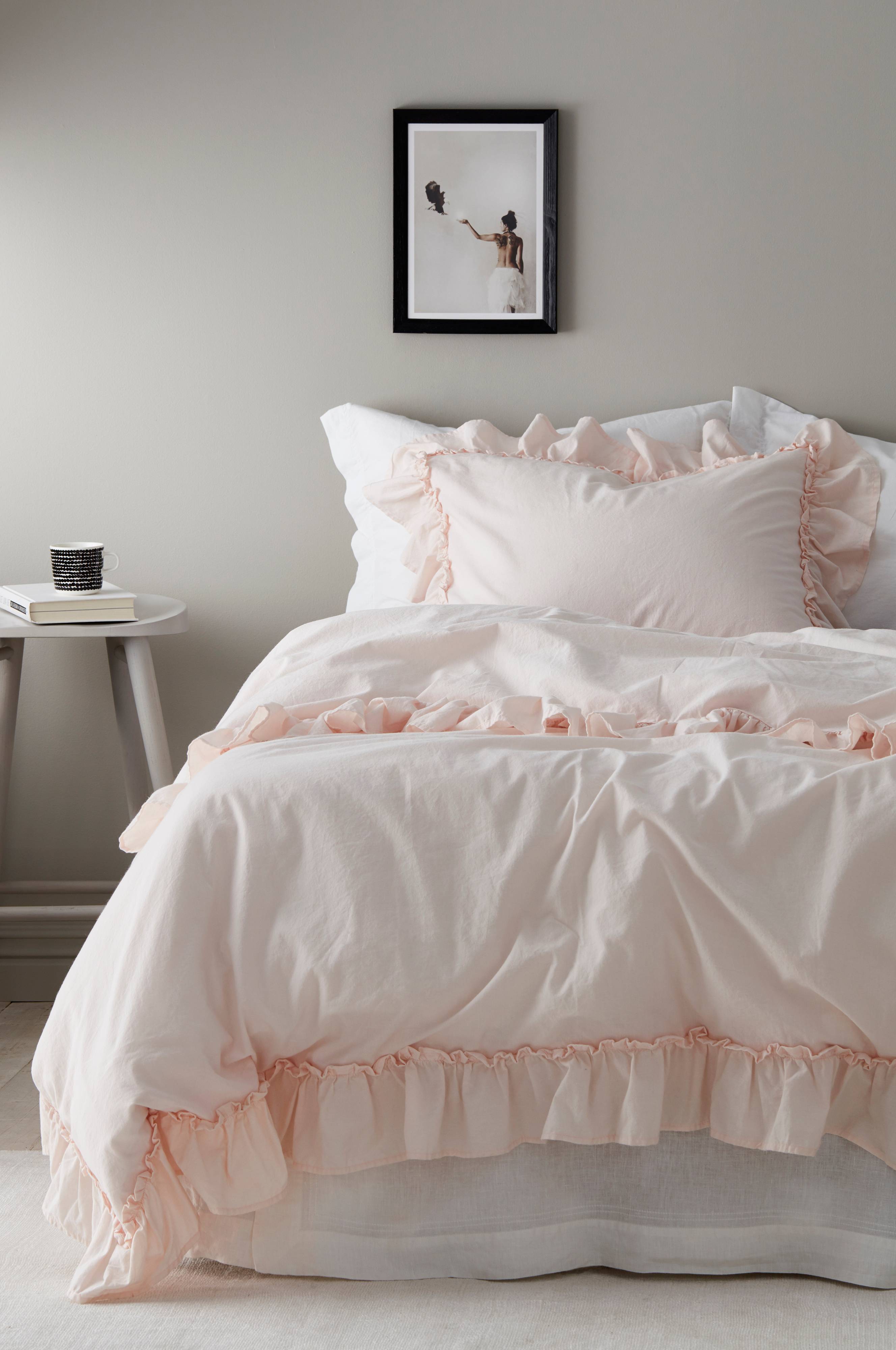 Sengesæt i skøn kvalitet af blødvasket, økologisk bomuld. Trådtæthed 144 tc. Dynebetræk og pudebetræk med 13 cm rynket flæse hele vejen rundt. Trykknapper i kanten forneden på dynebetrækket. Ingen huller i siden til brug ved opredning.