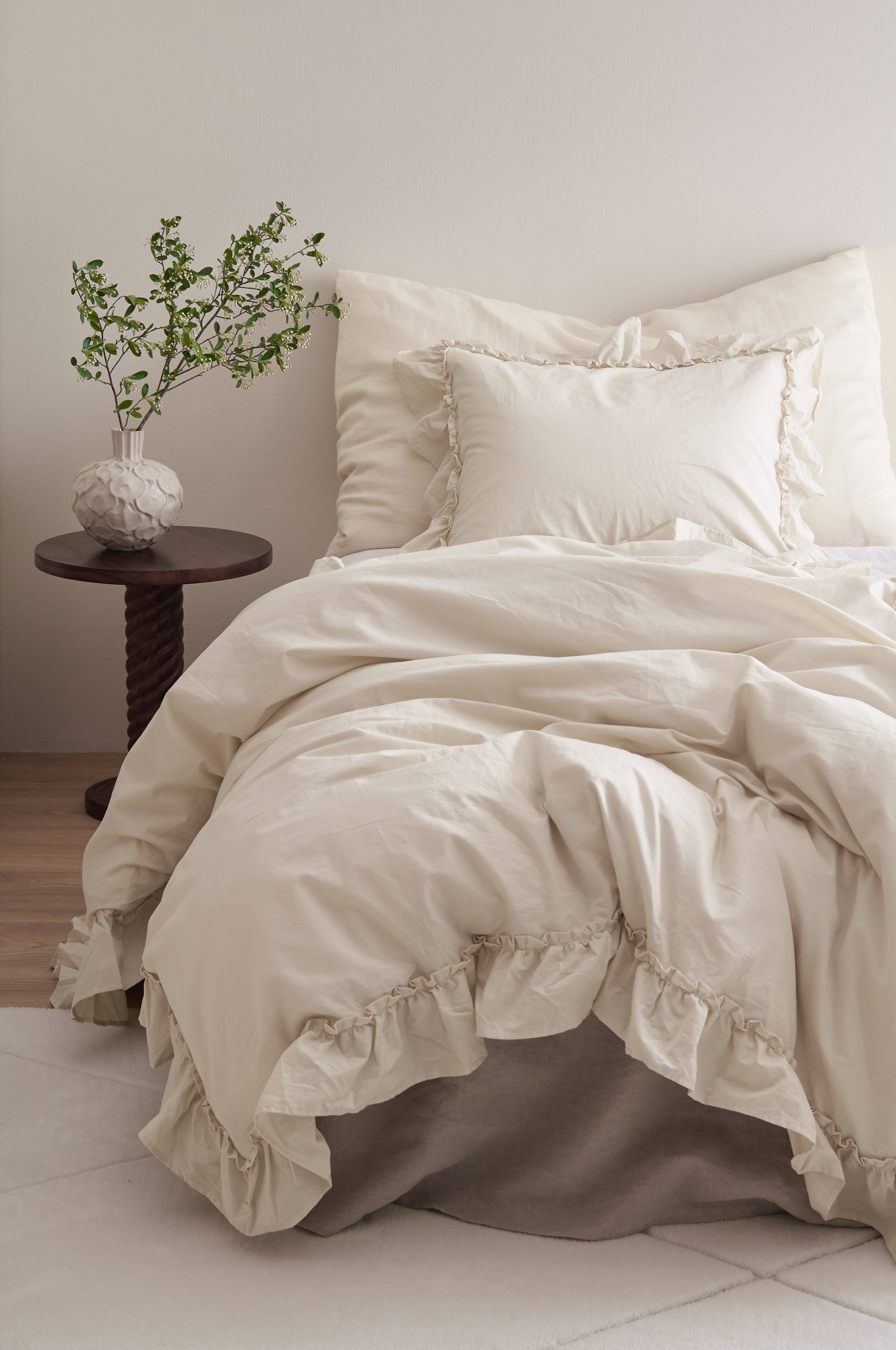 Sengesæt i skøn kvalitet af blødvasket, økologisk bomuld. Trådtæthed 144 tc. Dynebetræk og pudebetræk med 13 cm rynket flæse hele vejen rundt. Trykknapper i kanten forneden på dynebetrækket. Ingen huller i siden til brug ved opredning.