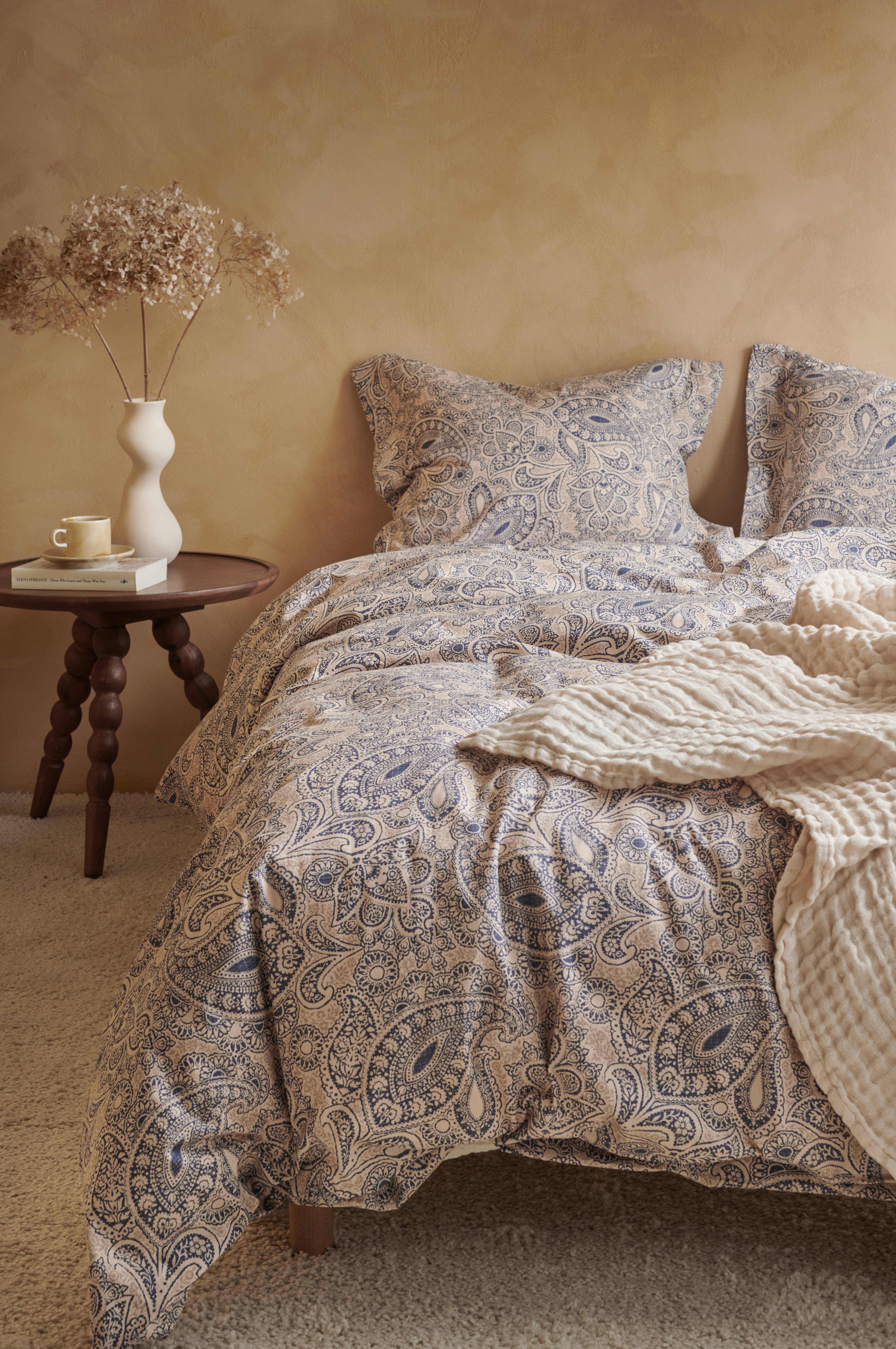 Sengesæt i skøn kvalitet af blødvasket bomuld med printet paisleymønster. Trådtæthed 144 tc. Trykknapper i kanten forneden på dynebetrækket.