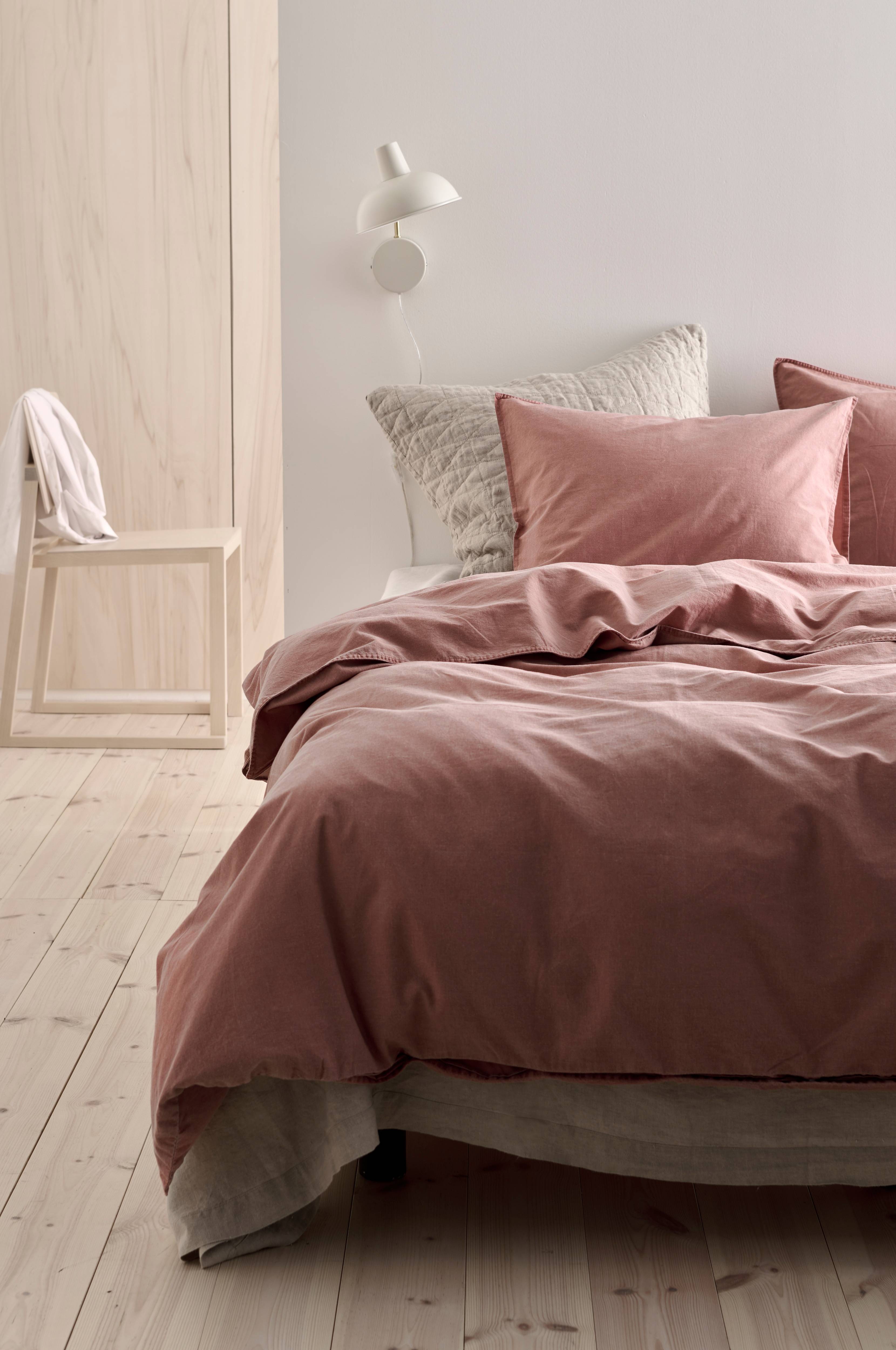 Sengesæt i vintagevasket økologisk bomuld. Trådtæthed 144 TC. Dobbelte jeanssømme hele vejen rundt. Trykknapper i kanten forneden på dynebetrækket. Ingen huller i siden til brug ved opredning. Leveres i stofpose i samme kvalitet med løbegang. Dynebetræk 150x210 cm og pudebetræk 50x60 cm.