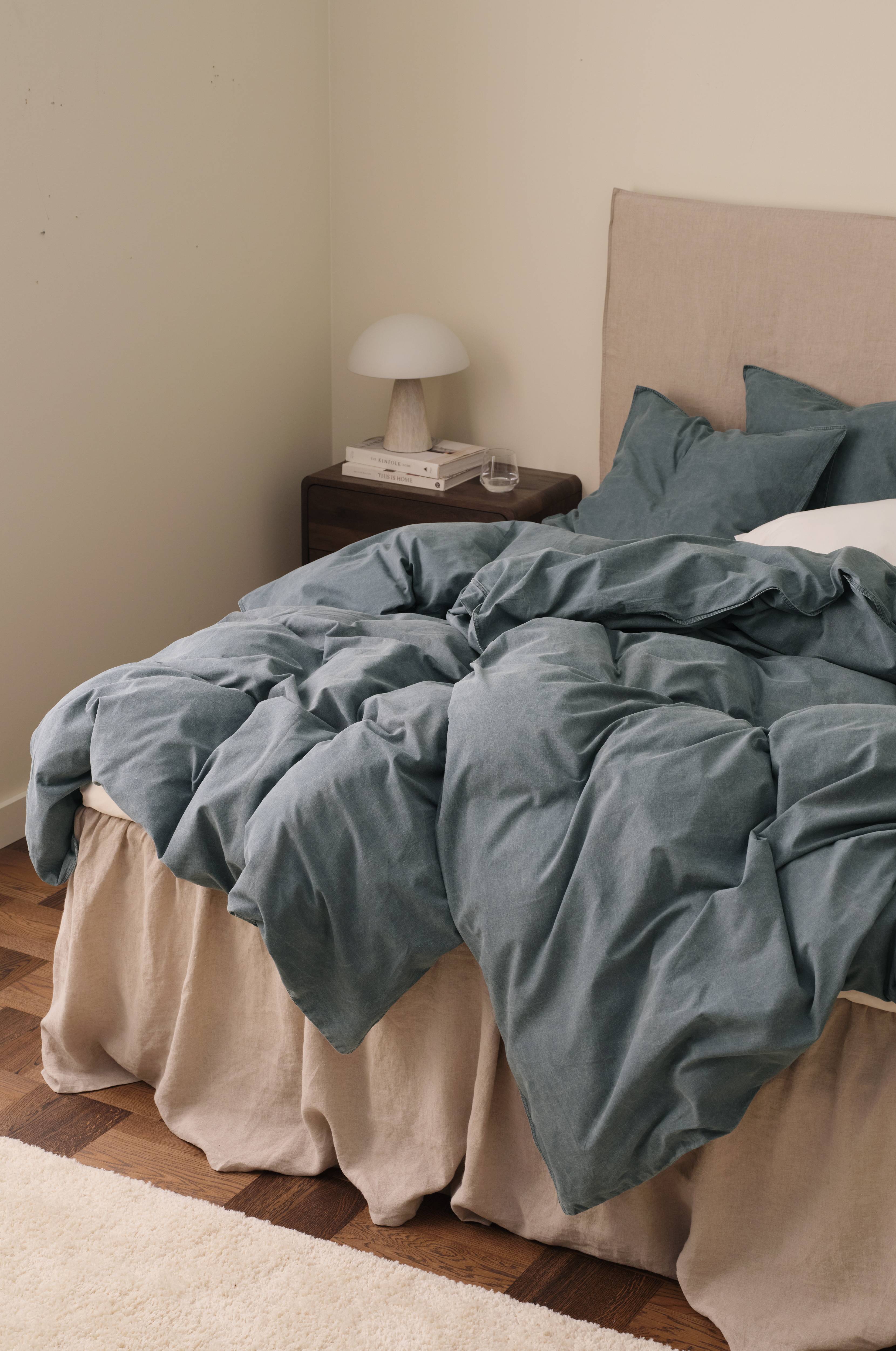 Sengesæt i vintagevasket økologisk bomuld. Trådtæthed 144 TC. Dobbelte jeanssømme hele vejen rundt. Trykknapper i kanten forneden på dynebetrækket. Ingen huller i siden til brug ved opredning. Leveres i stofpose i samme kvalitet med løbegang. Dynebetræk 150x210 cm og pudebetræk 50x60 cm.