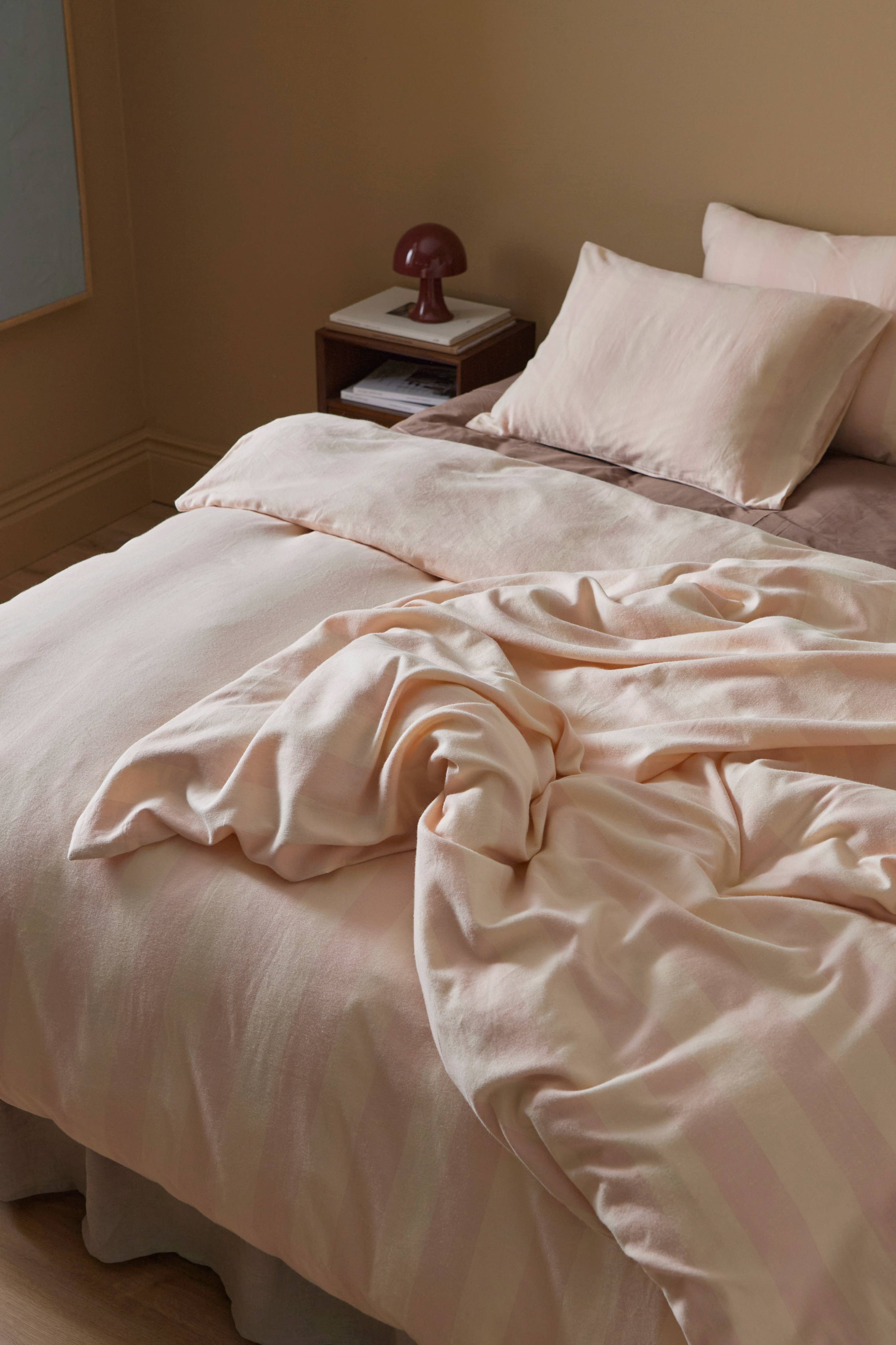 Dynebetræk i flonel af økologisk bomuld med garnfarvede striber. Vasket kvalitet med blød, børstet overflade og dobbelte jeanssømme. Trådtæthed 110 TC. Dynebetrækket har trykknapper i kanten forneden. Ingen huller til sengetøjsskift.