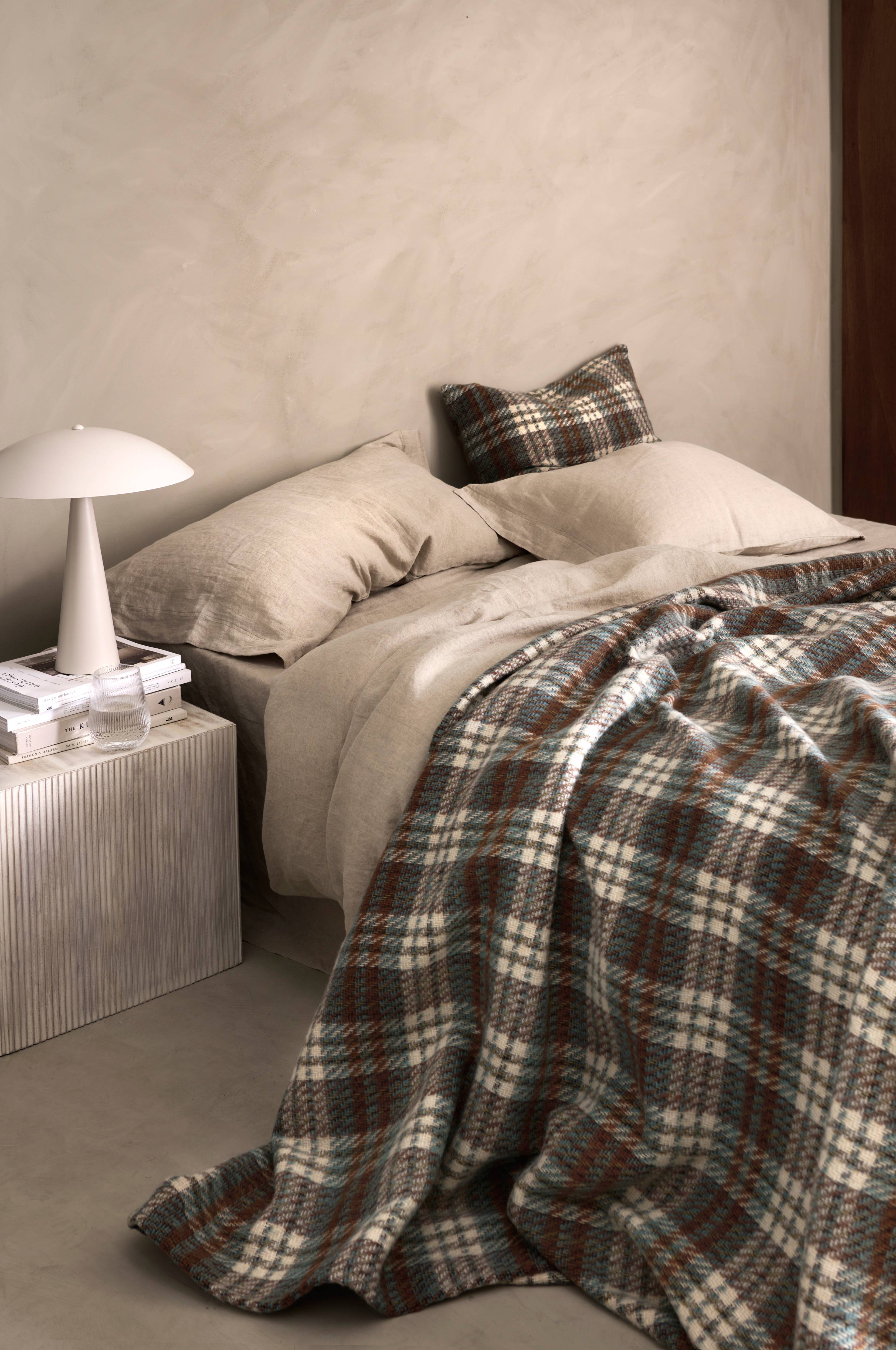 Ternvævet sengetæppe i uldblanding med børstet forside. Sømmet kant rundt om.