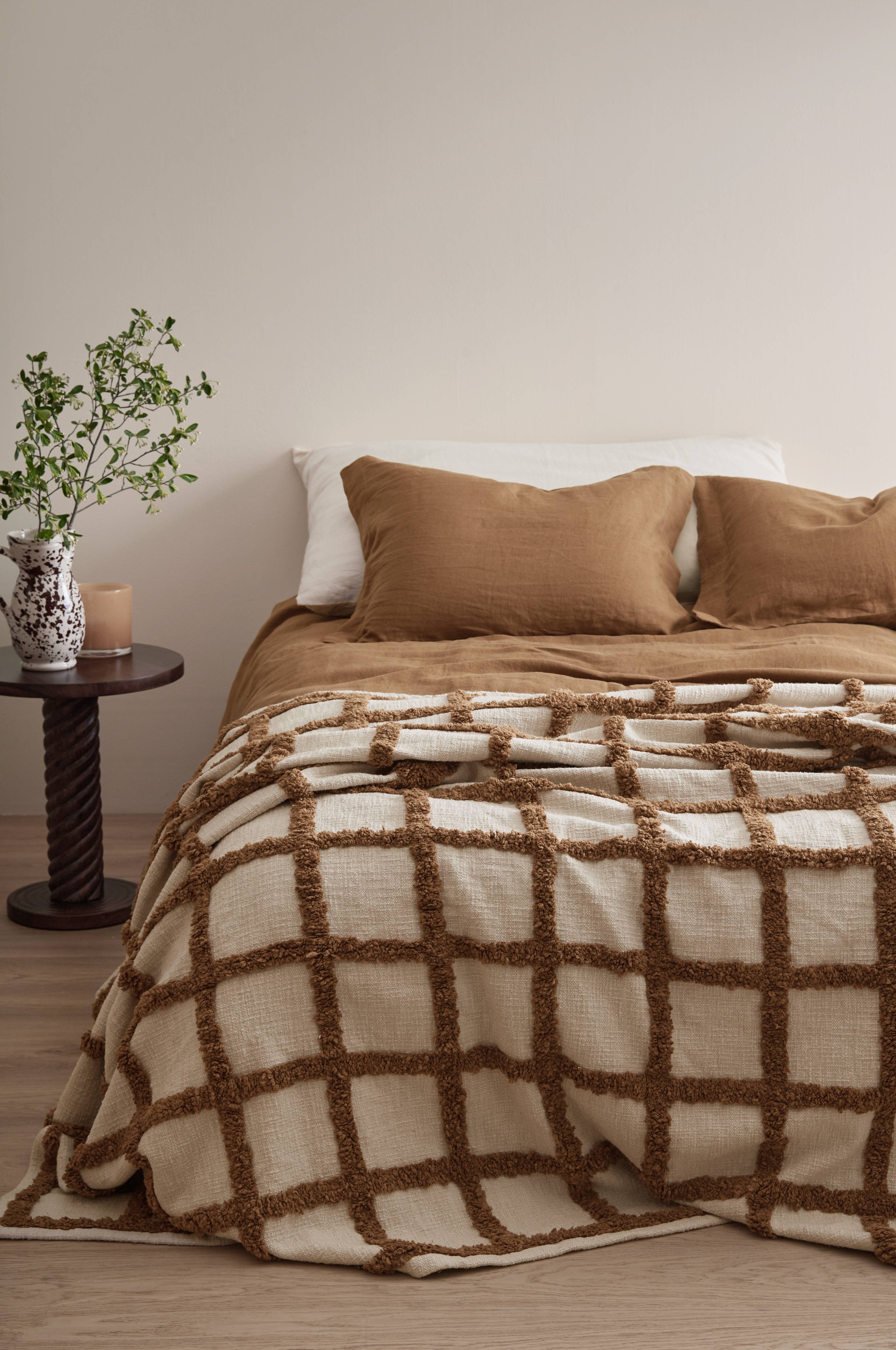 Blødt sengetæppe af bomuld i kraftig kvalitet med tuftet tern på forsiden og glat bagside.