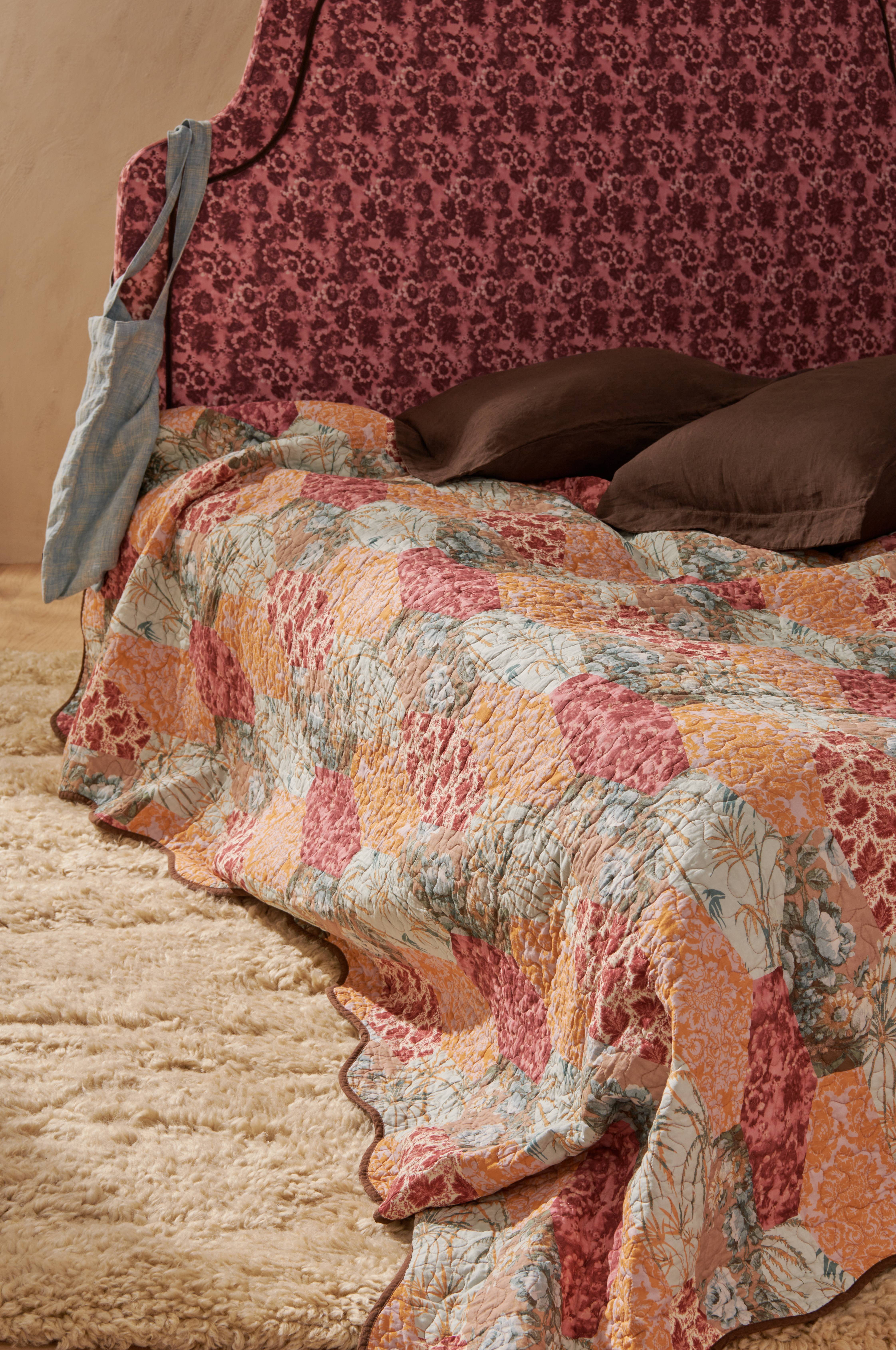 Quiltet sengetæppe i vasket bomuld med printet mønster på for- og bagsiden. Bølgede kanter med ensfarvet kantbånd.