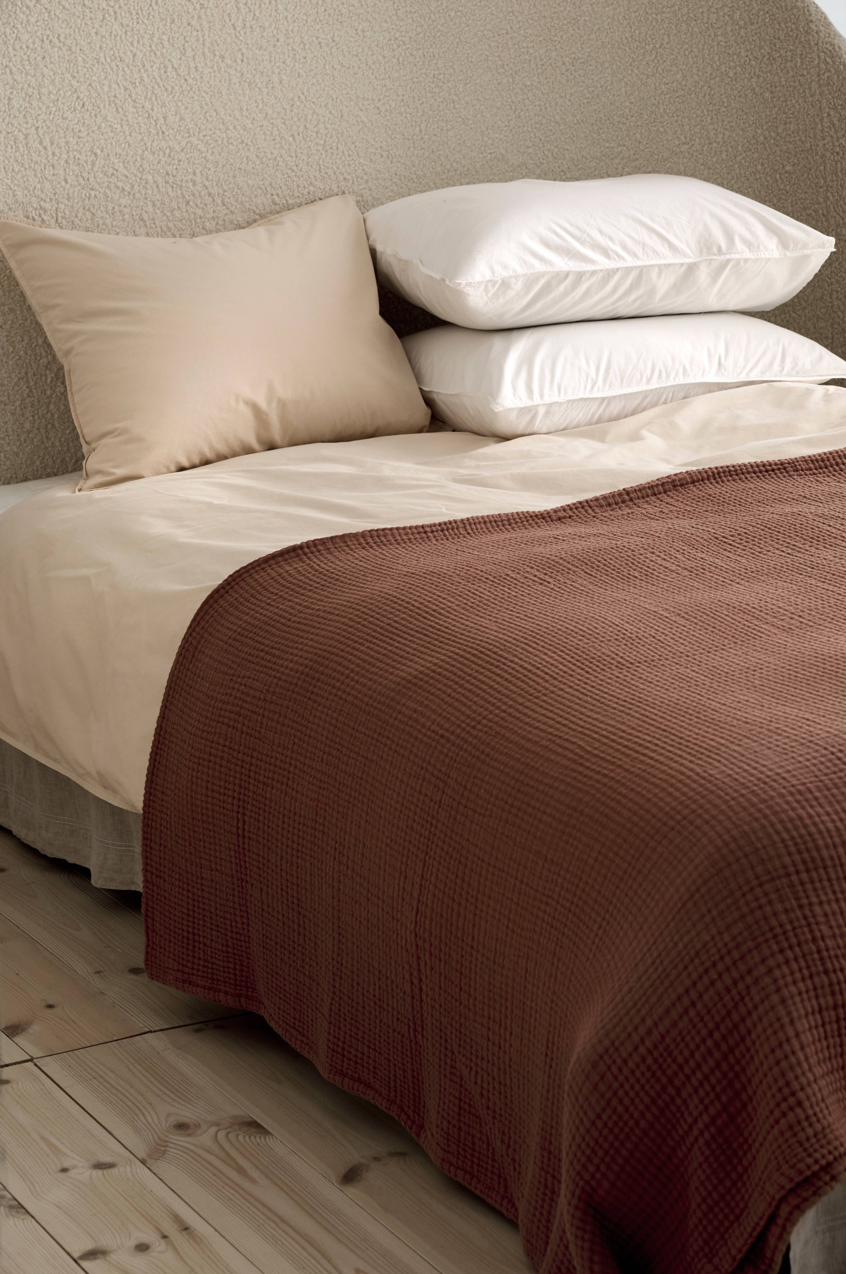 Sengetæppe af økologisk bomuldsmuslin i 4 lag. Sømmede kanter. Leveres rullet.