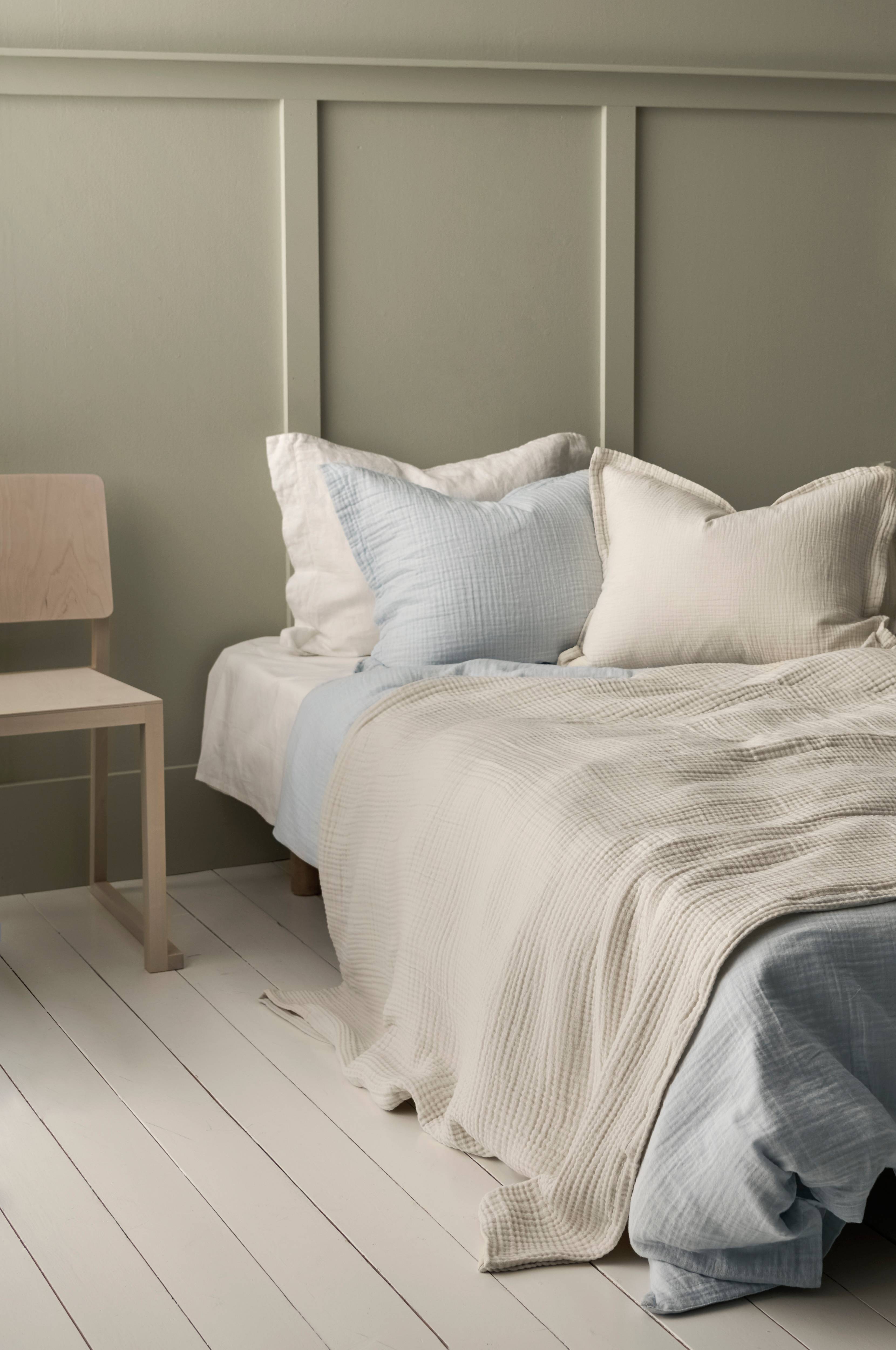 Sengetæppe af økologisk bomuldsmuslin i 4 lag. Sømmede kanter. Leveres rullet.