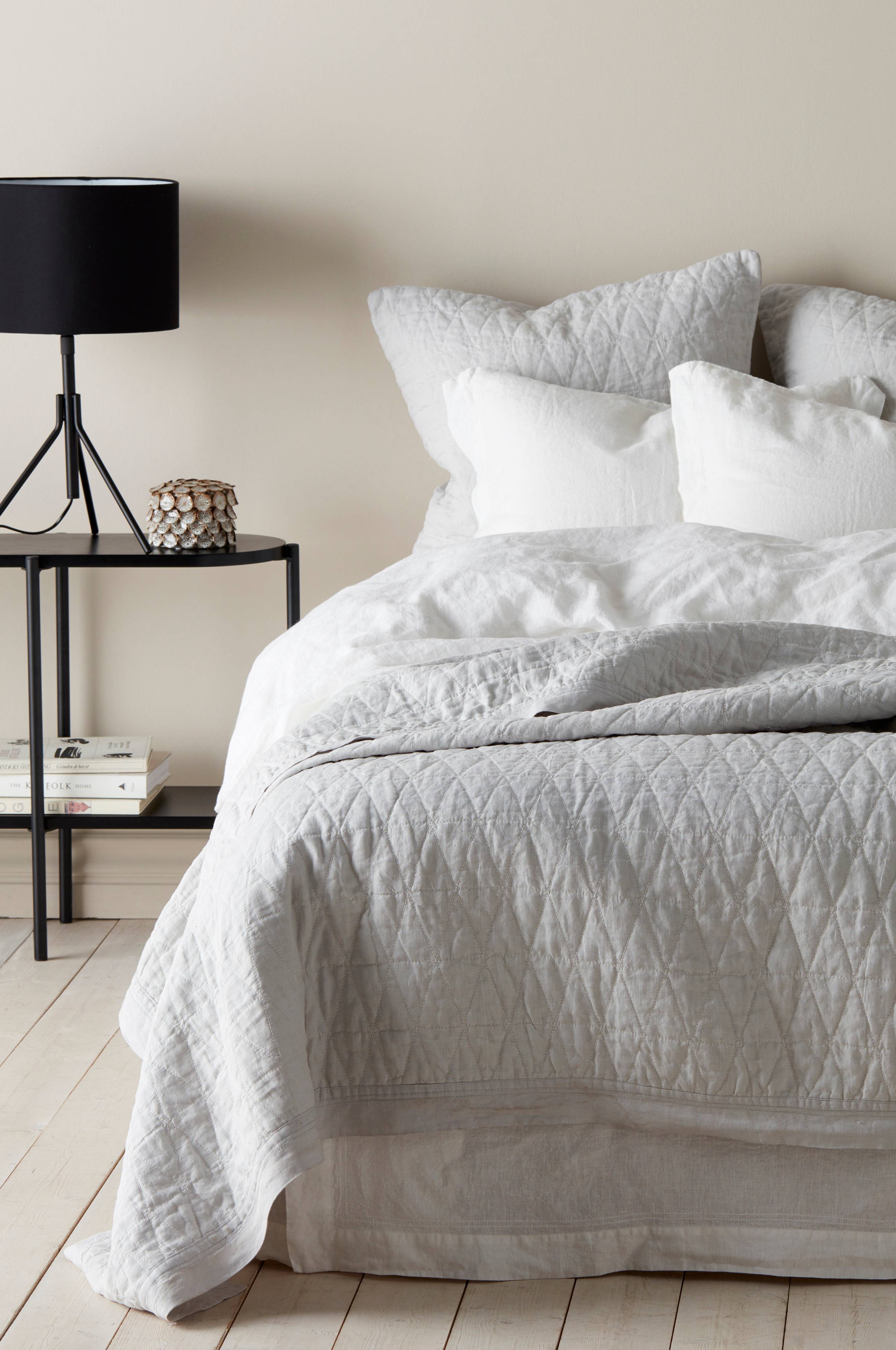 Sengetæppe Candice i hør med quiltet grafisk mønster. 5 cm kant rundt om. Str. 180x260 cm (passer til seng 120x200 cm og 140x200 cm).