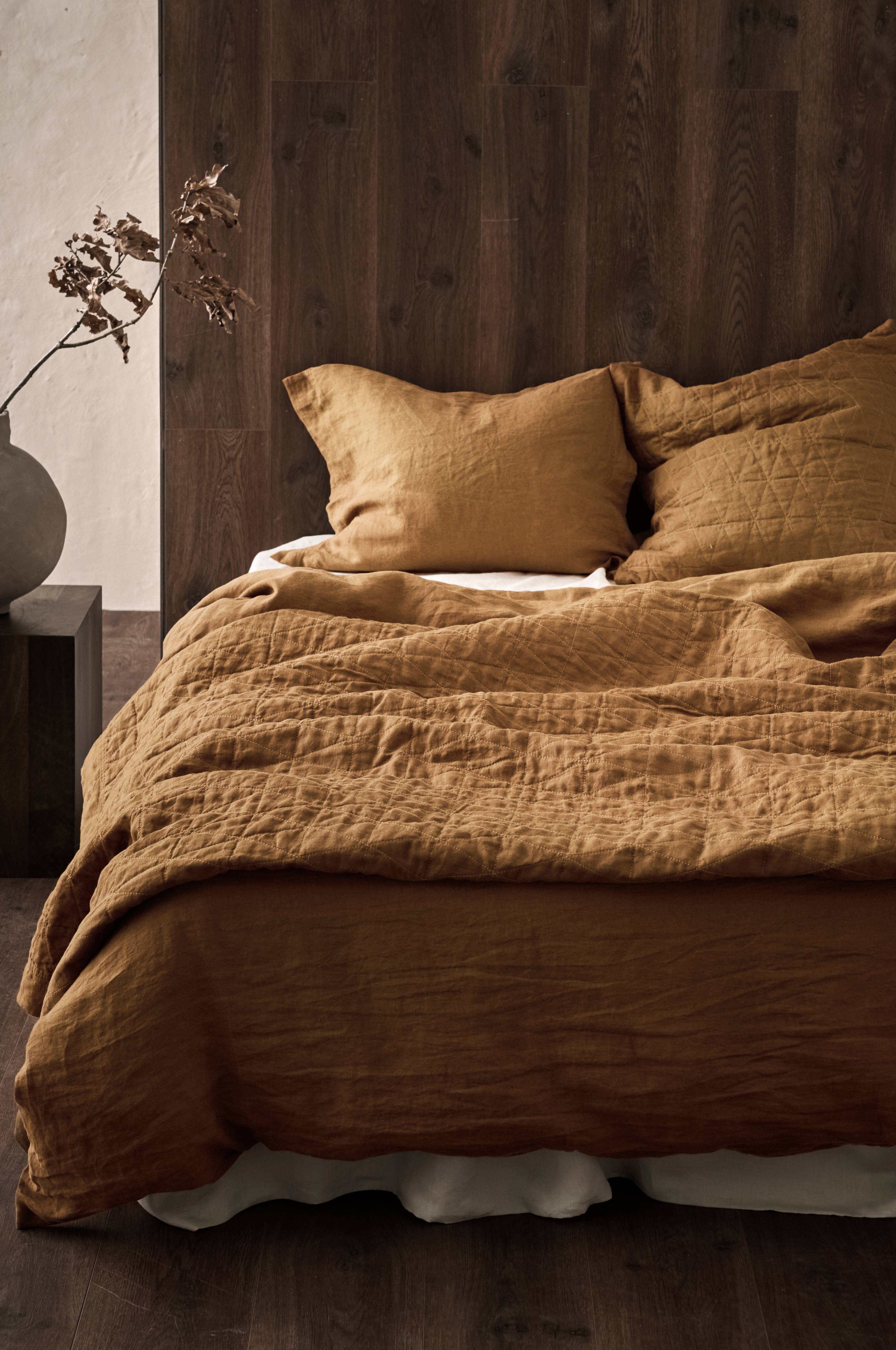 Elsker mit nye sengetæppe i kanelfarven, som føles blødt og luksuriøst. Til det har jeg også bestilt forskellige pudebetræk i rustbrun og lyserød.