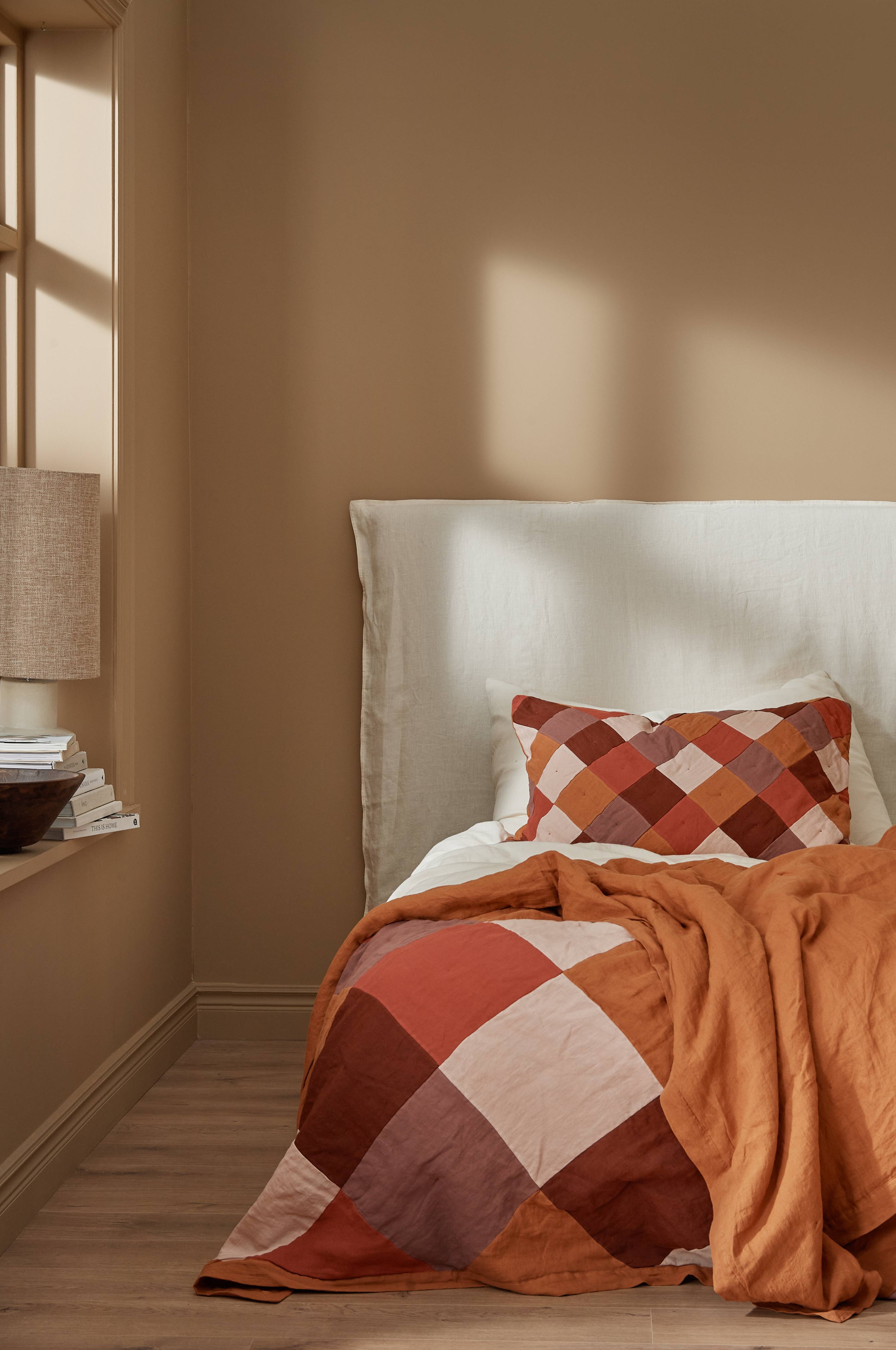 Quiltet sengetæppe i vasket hør. Patchwork foran med håndskårne firkanter, der er syet i hånden. Ensfarvet bagside. Ensfarvet kant rundt om.