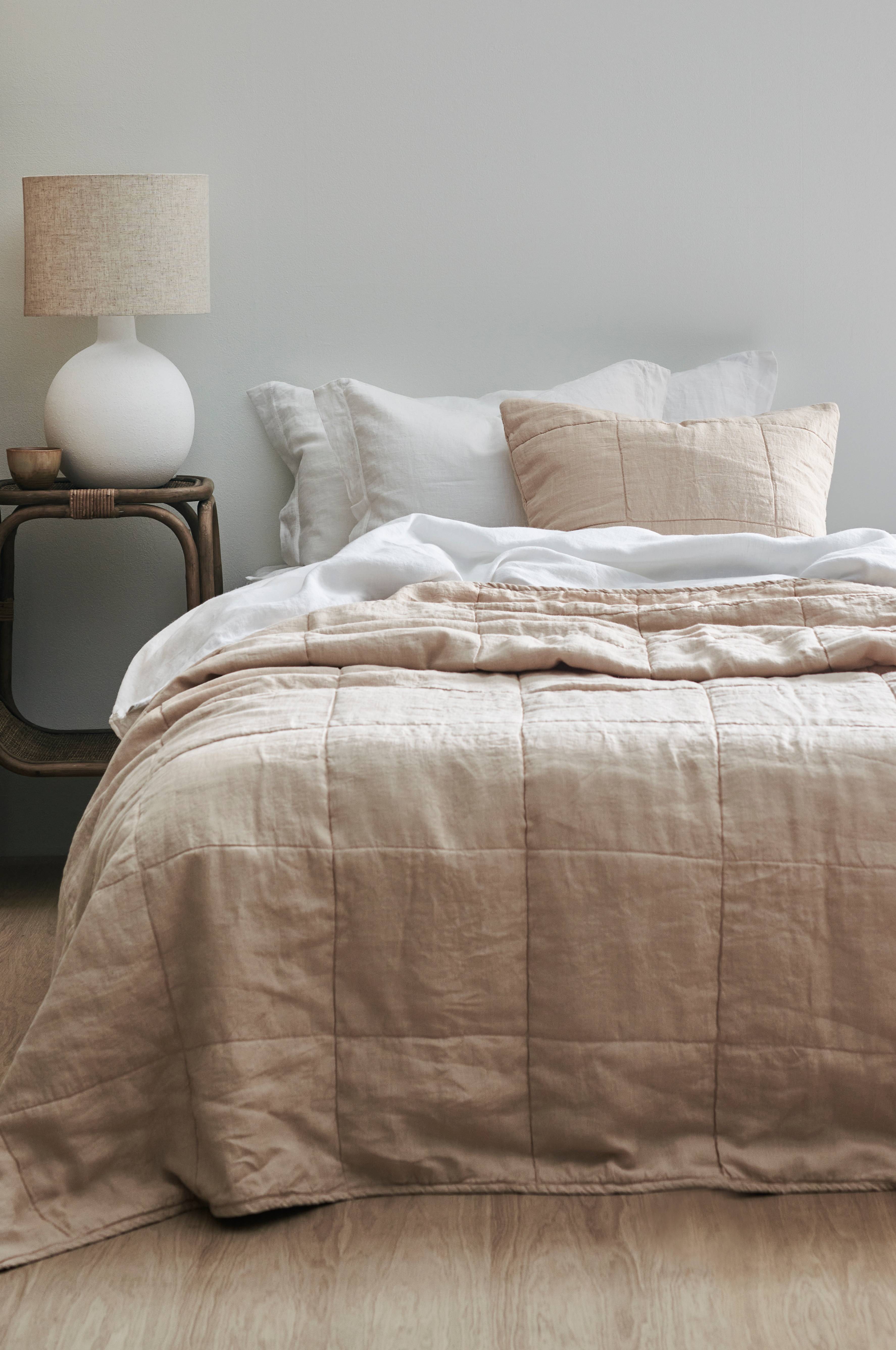 Let, ternquiltet sengetæppe med forside i vasket hør. Bagside i bomuld.