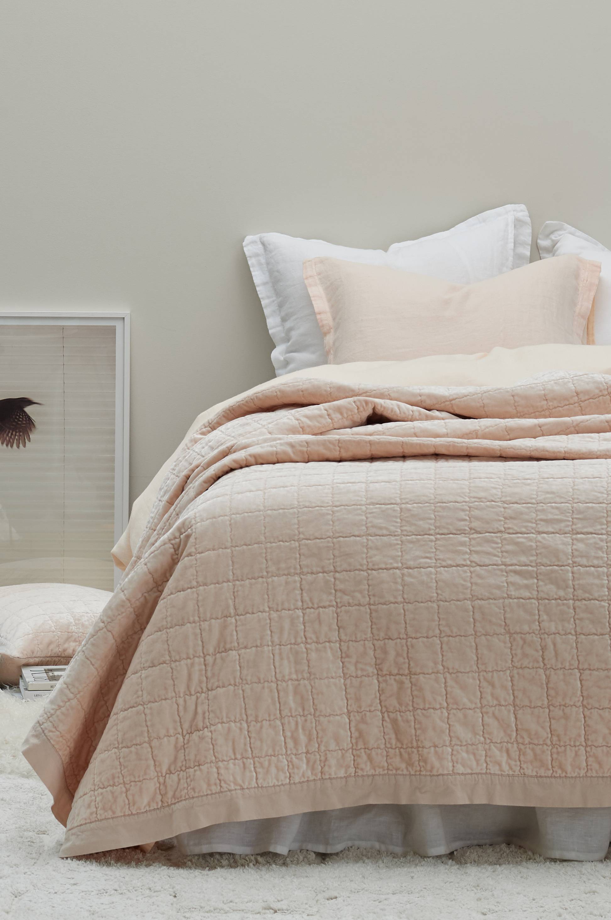 Fin og lige højre tyk sengetæppe. Farven er mere abrikos end lyserød.