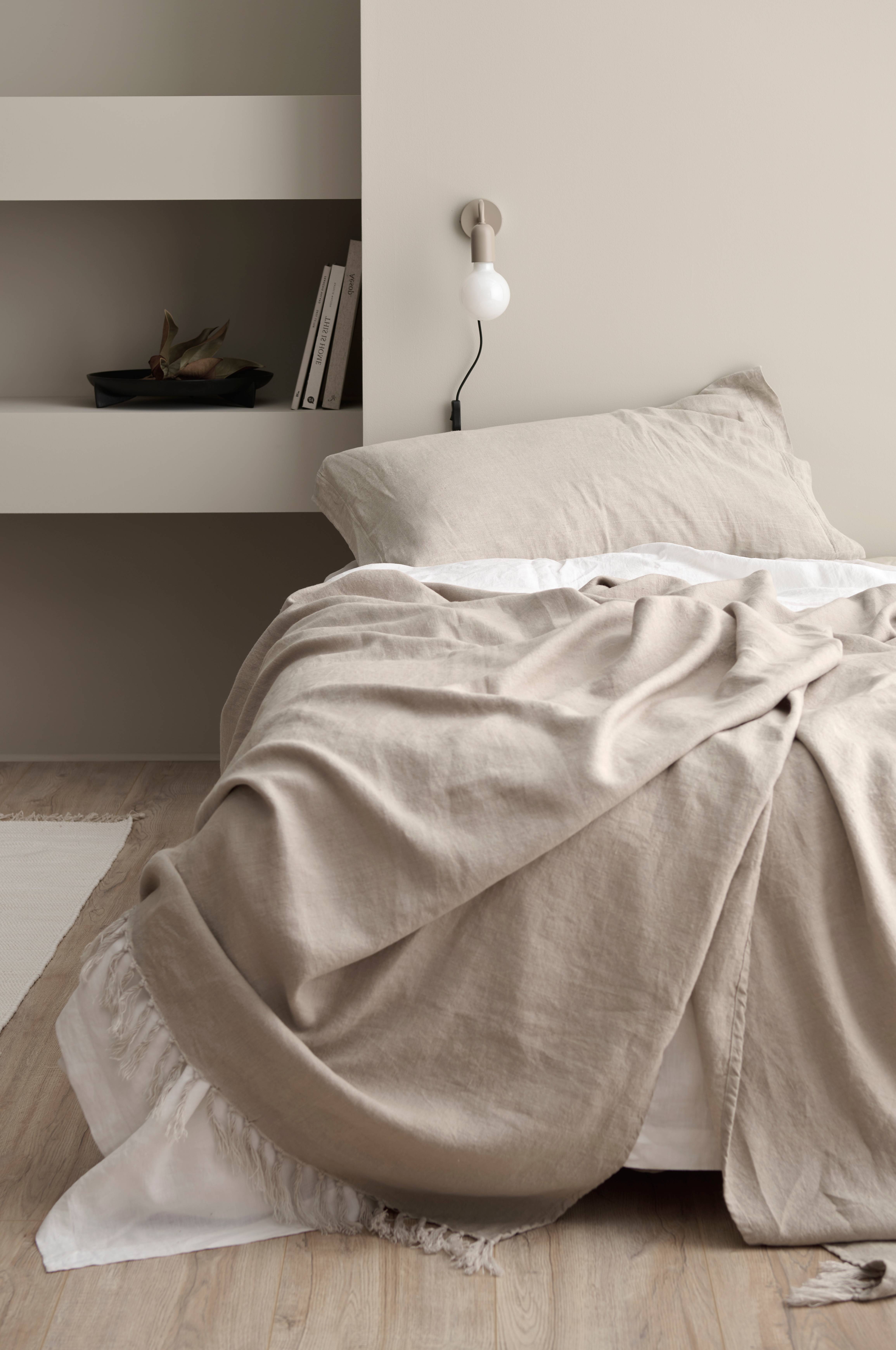 Sengetæppe af vasket, fransk hør i kraftig kvalitet med frynser på to sider. Kan også anvendes som plaid.