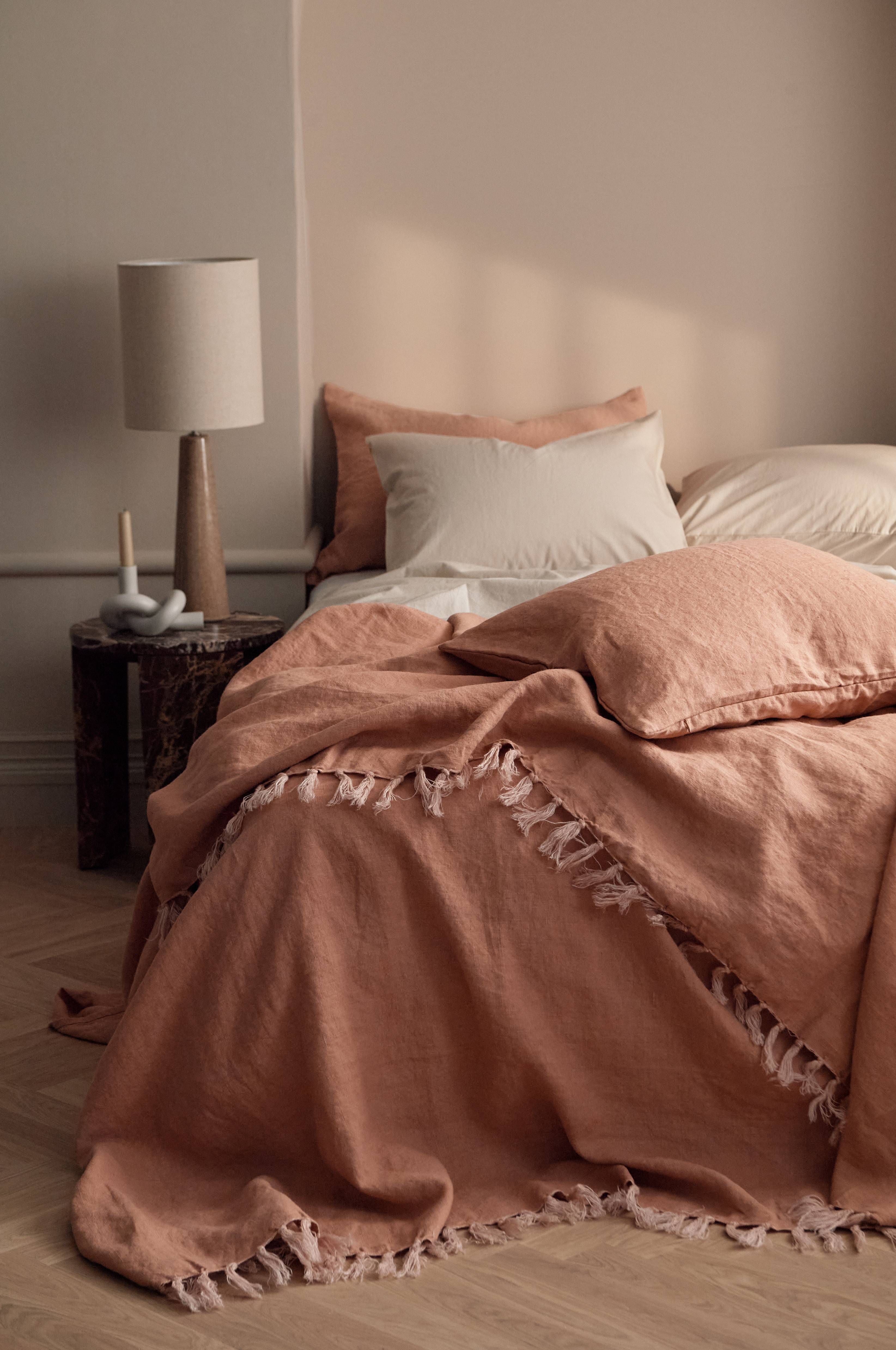 Sengetæppe af vasket, fransk hør i kraftig kvalitet med frynser på to sider. Kan også anvendes som plaid.