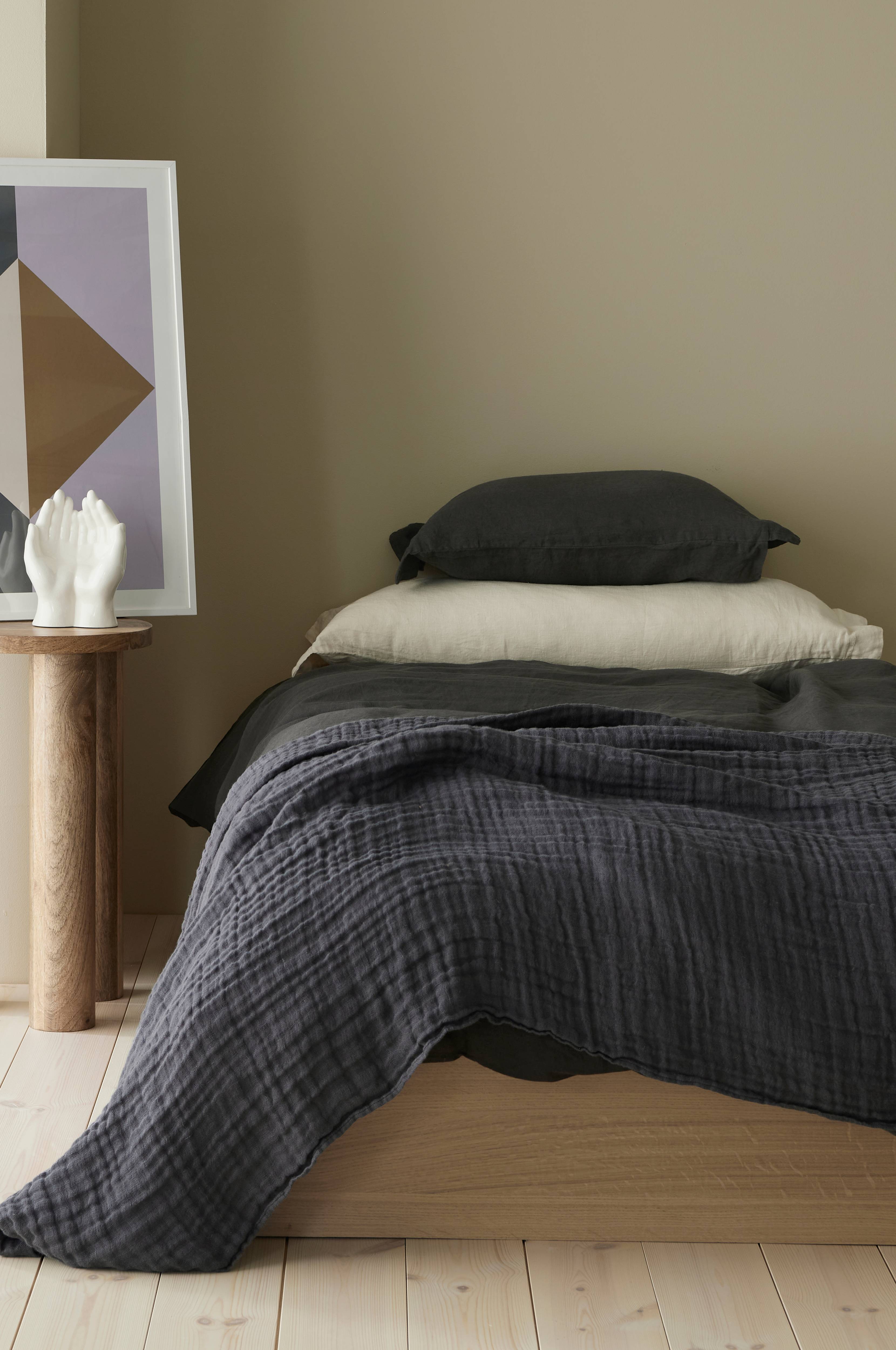 Sengetæppe af vasket, fransk hør i afslappet og let kvalitet. Sengetæppet er vævet i tre lag med flot struktur.