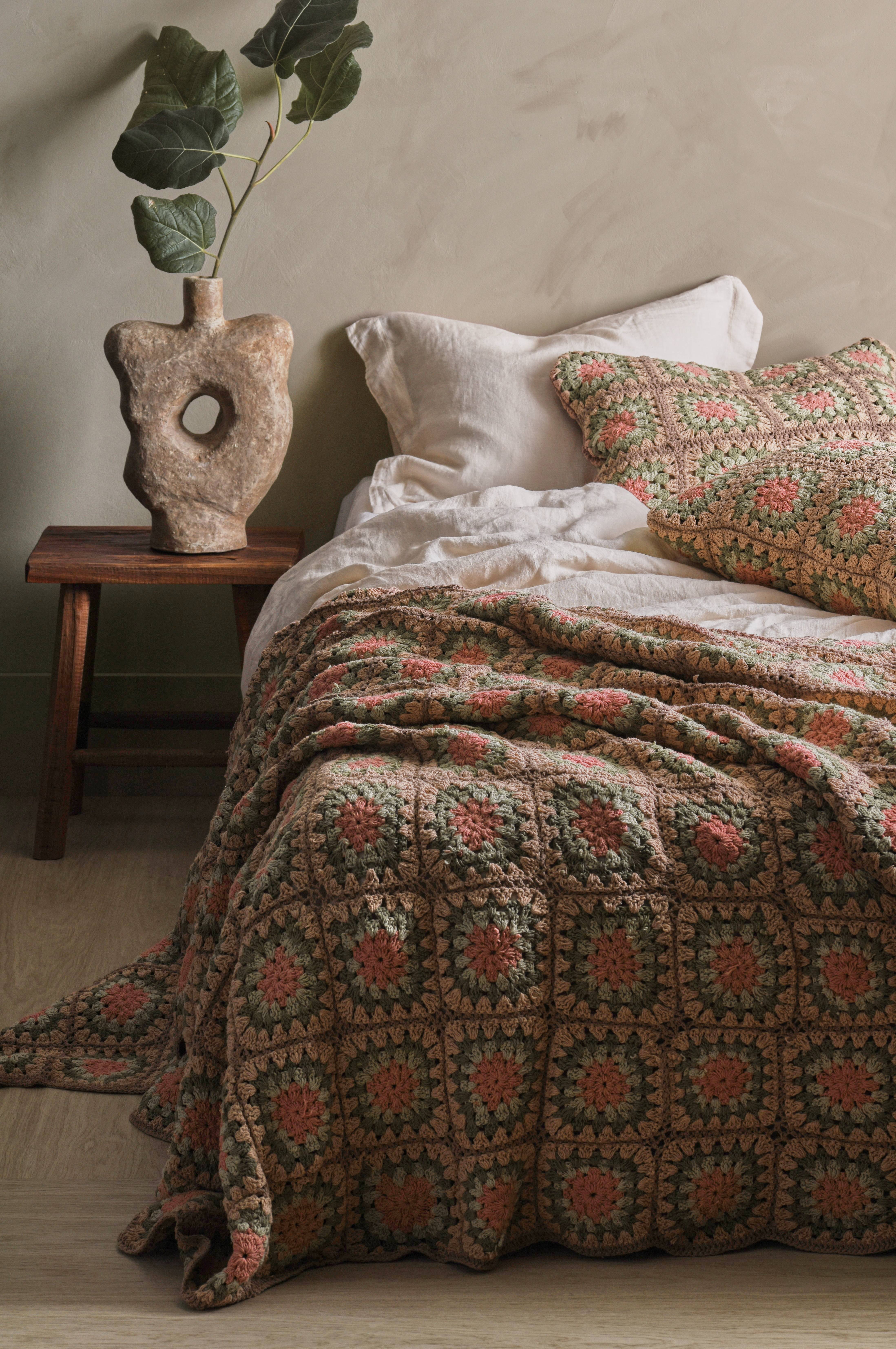 Hæklet sengetæppe af bomuld i traditionelt design med hæklede firkanter som er syet sammen.