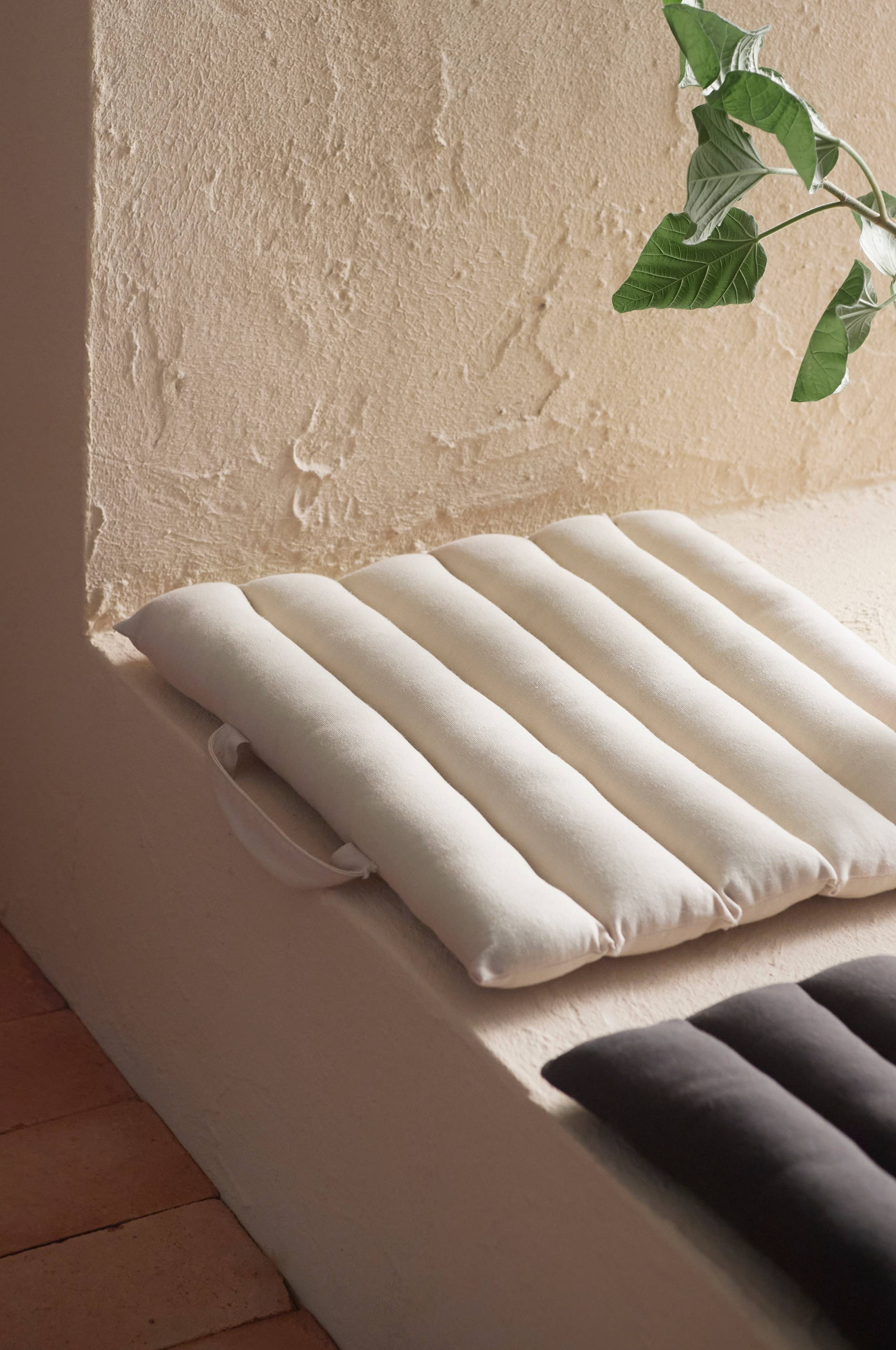 Siddehynde i bomuld med syede kanaler. Håndtag i den ene ende. Fyld af genindvundet polyester. Str. 45x45 cm. Tykkelse 3 cm.