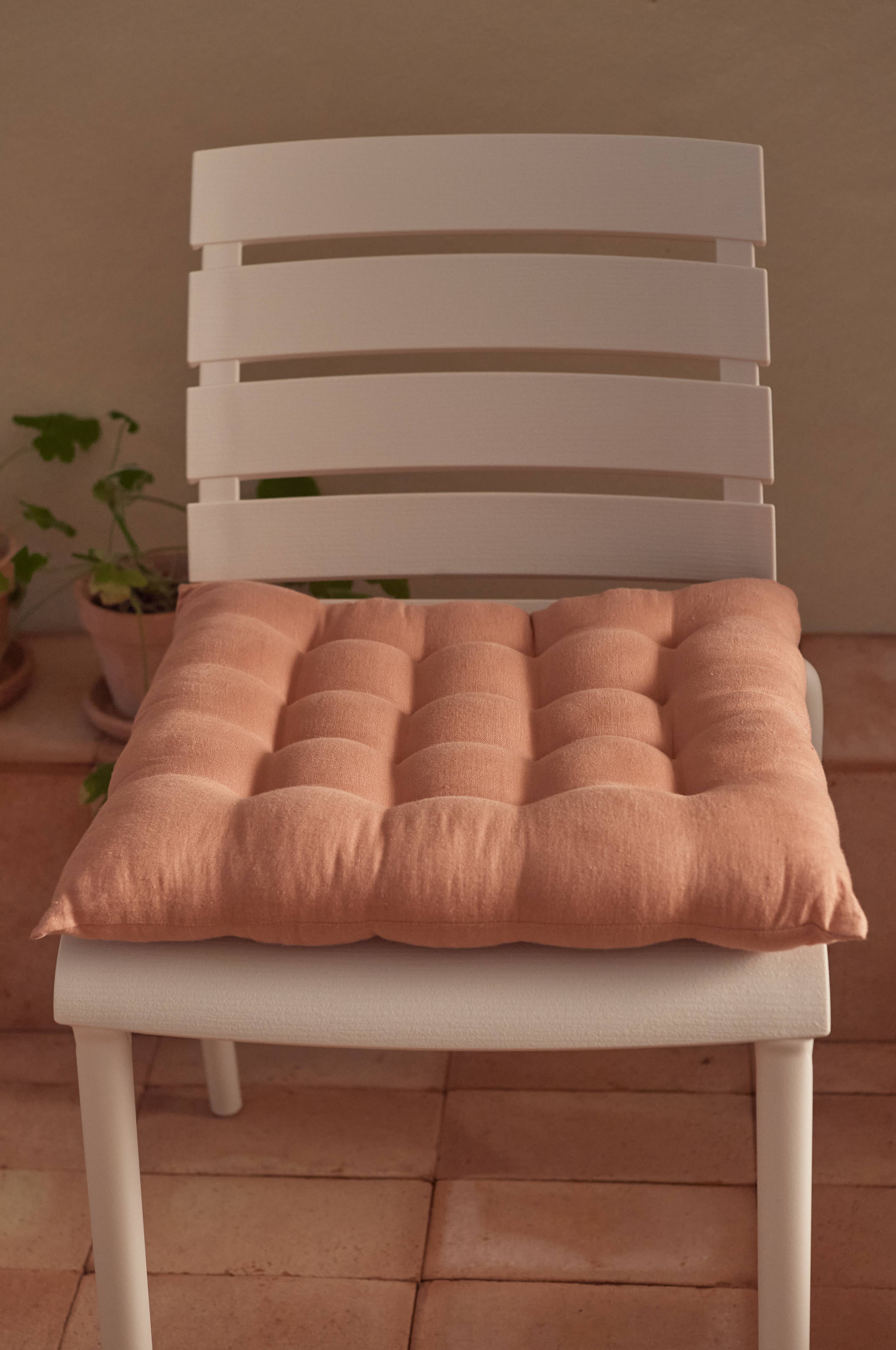Siddehynde i blød vasket kvalitet af fransk hør med vintagelook og dekorative, håndsyede sting. Fyld af polyester. Str. 40x40x5 cm.