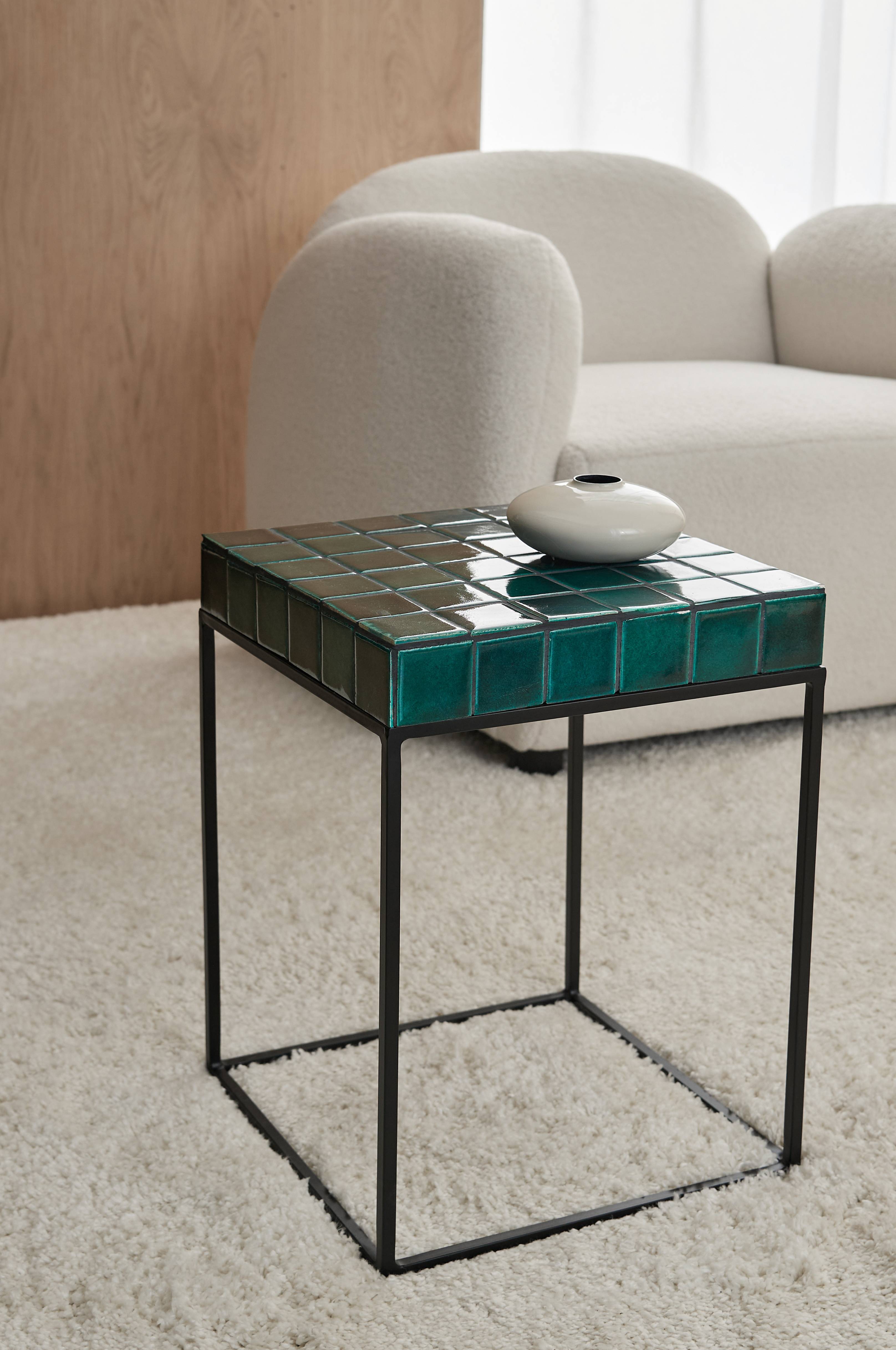 Sidebord med stel i pulverlakeret metal. Bordplade fremstillet af kakler lagt i ternet mønster med en MDF-plade nedenunder.