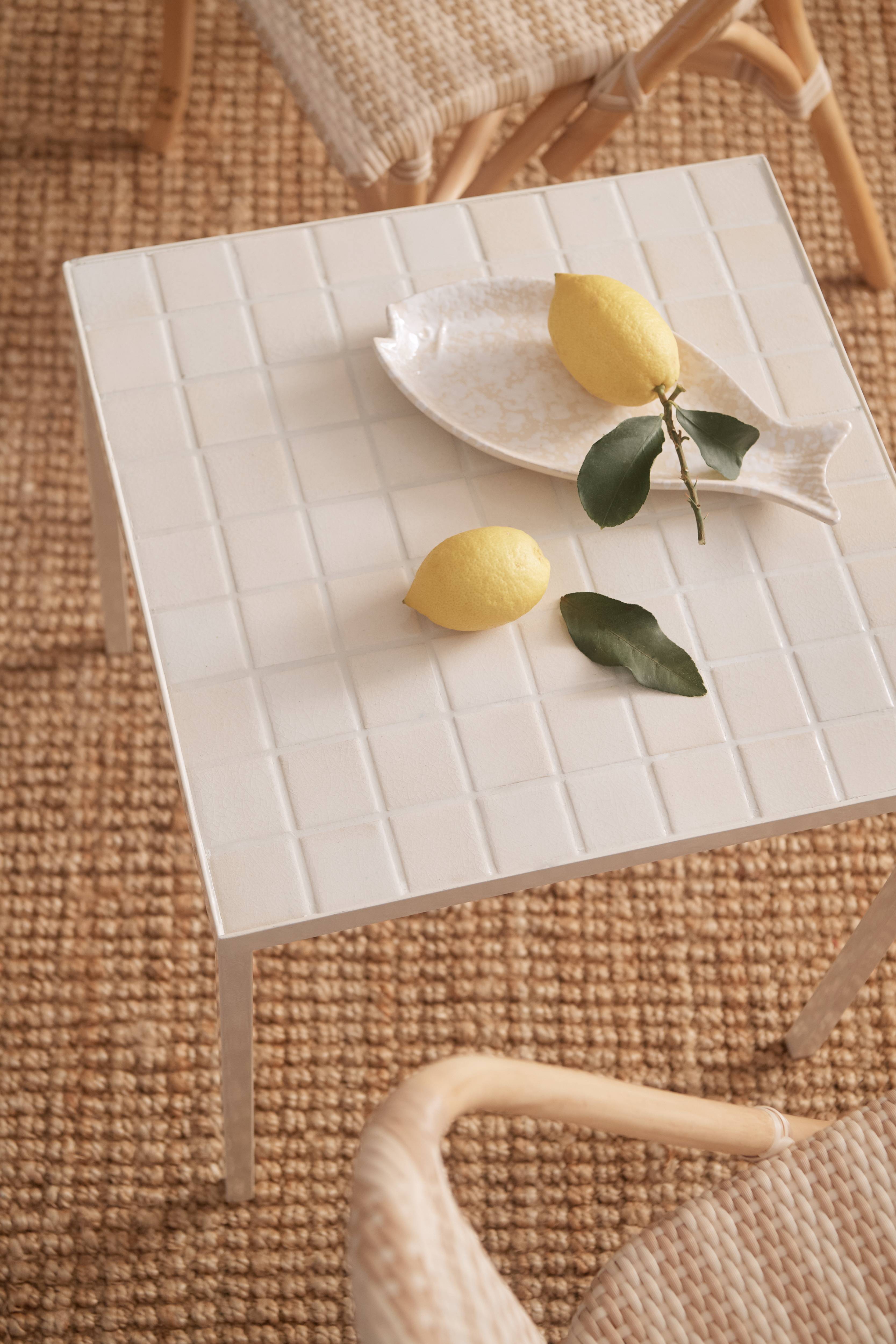 • Bordplade af MDF beklædt med fliser• Ben i metal• Bør opbevares under tag efter udendørs brug
