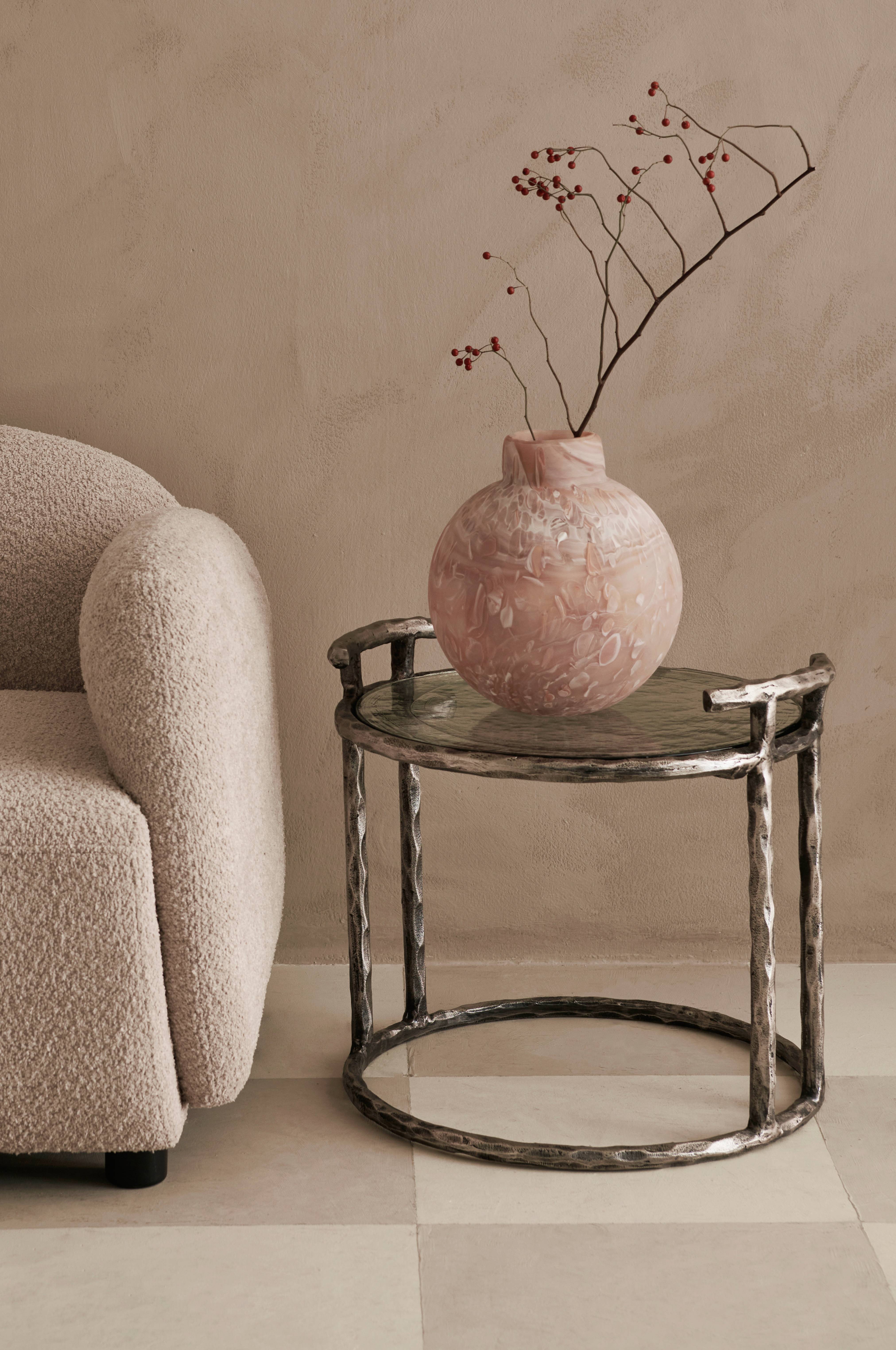 Sidebord/sengebord med rustikt look. Stel af aluminium med grov, uregelmæssig struktur i antikfinish. Bordplade af tykt, tempereret glas med uregelmæssig struktur. Glassets tykkelse 20 mm.