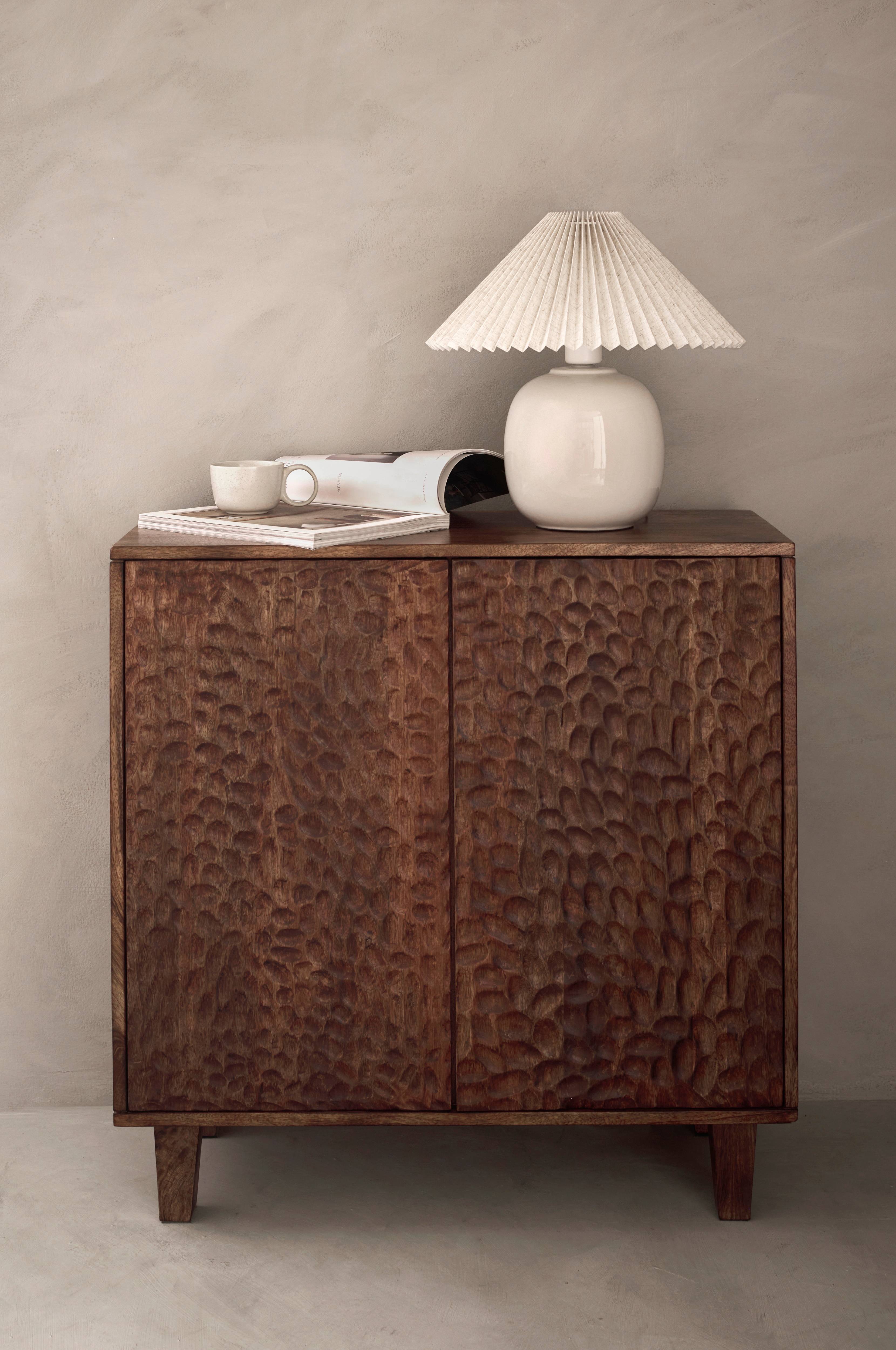 Skænk af massivt mangotræ med vokset finish. 2 skabe med låger som har et smukt udskåret mønster. Lågerne har push-funktion. 1 fast hylde i hvert skab. Højde mellem hylder 31 cm. Frihøjde under møbel 13 cm. Lettere montering (kun benene skrues på).