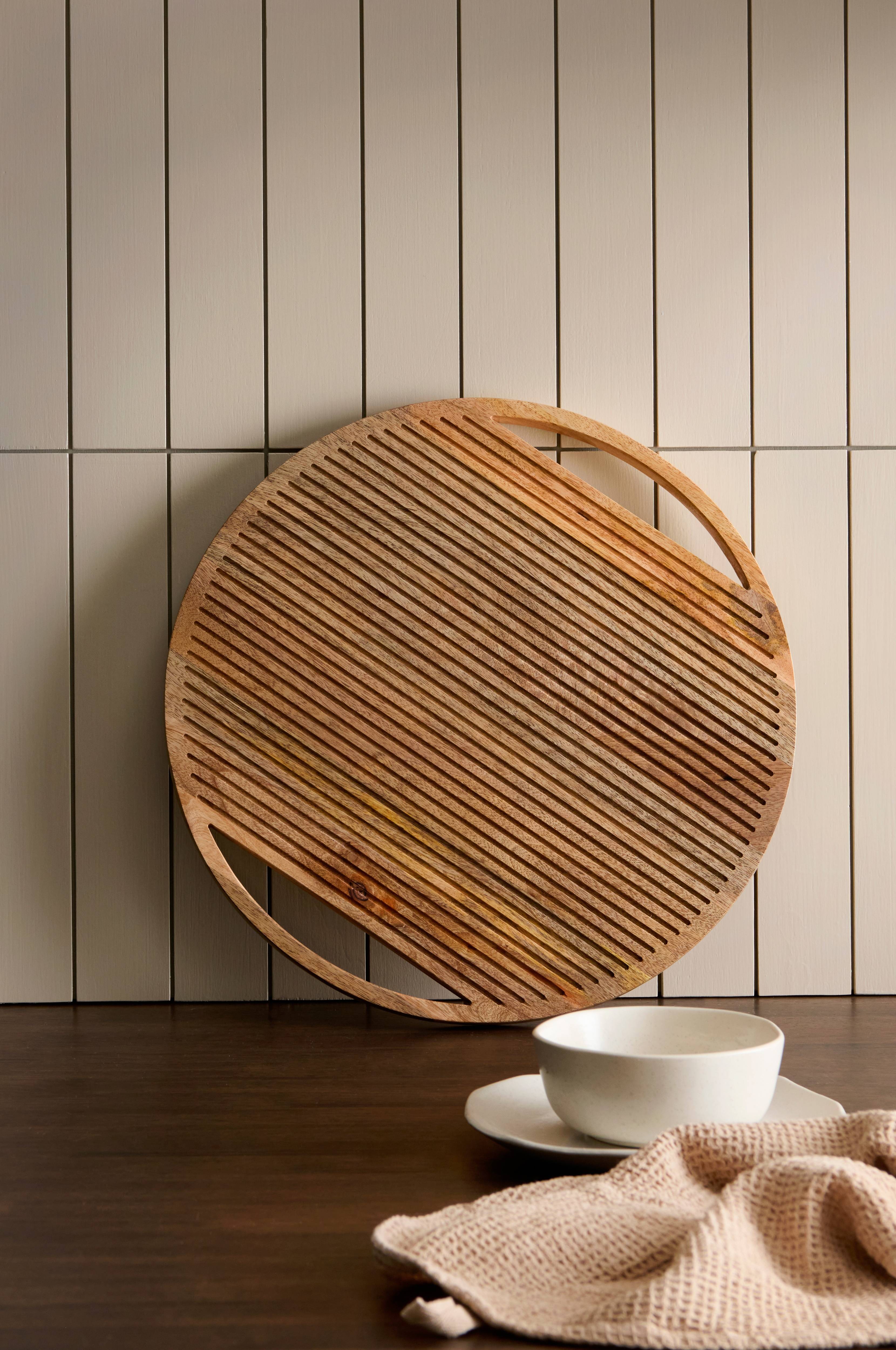 Dekorativt serveringsbræt i mangotræ med behandling, der gør det sikkert at bruge sammen med fødevarer. Riflet mønster på forsiden og glat bagside.