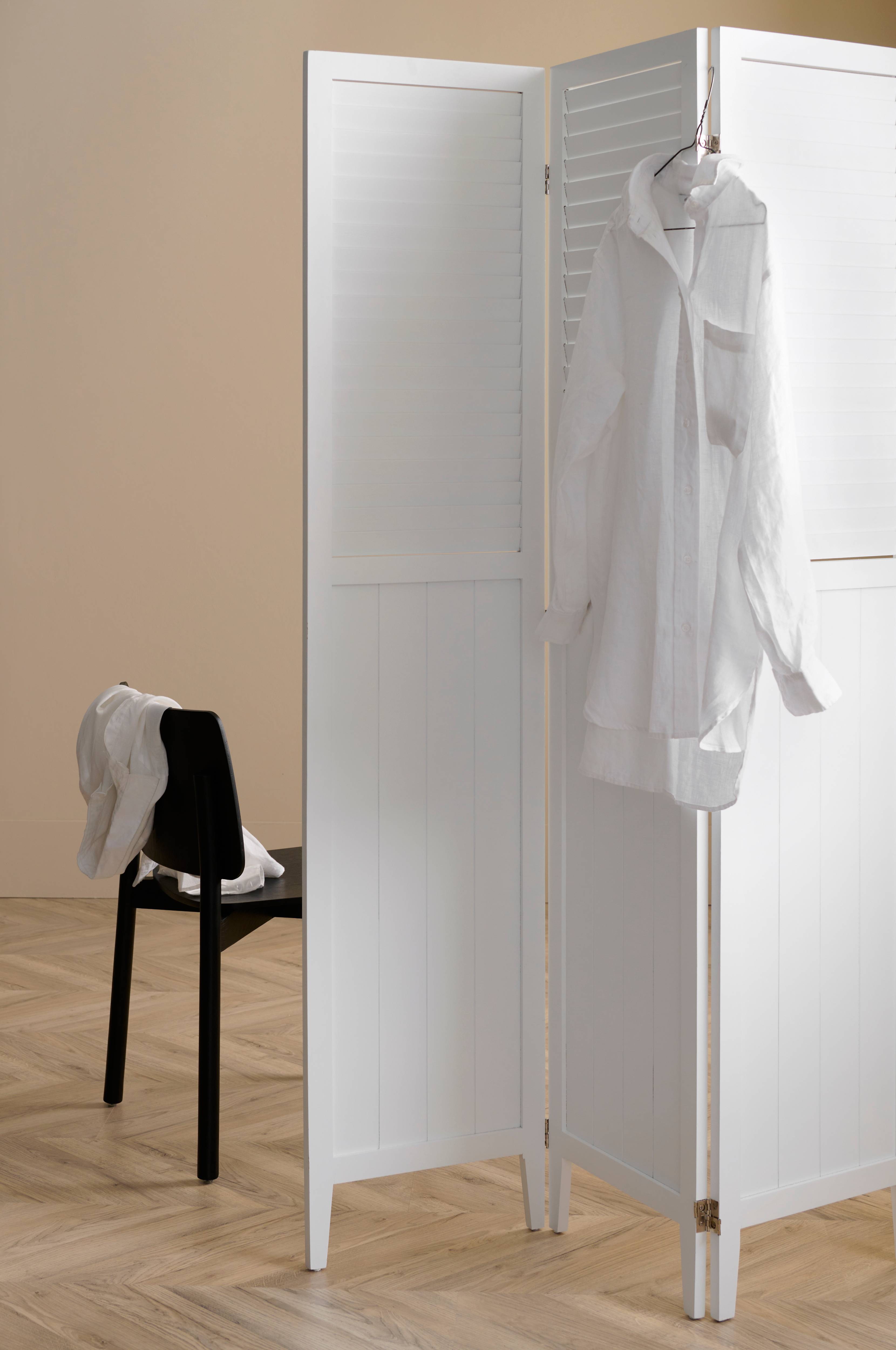Skærmvæg i tre dele, som kan foldes frit. Ramme og øvre del med jalousi i massivt træ. Nederste del i MDF. Højde 179 cm. Samlet bredde 122 cm (hver dels bredde 40 cm). Lev. samlet. Produktet indeholder FSC-certificeret træ, som er fældet i et ansvarsfuldt skovbrug, der tager hensyn til mennesker og miljø.