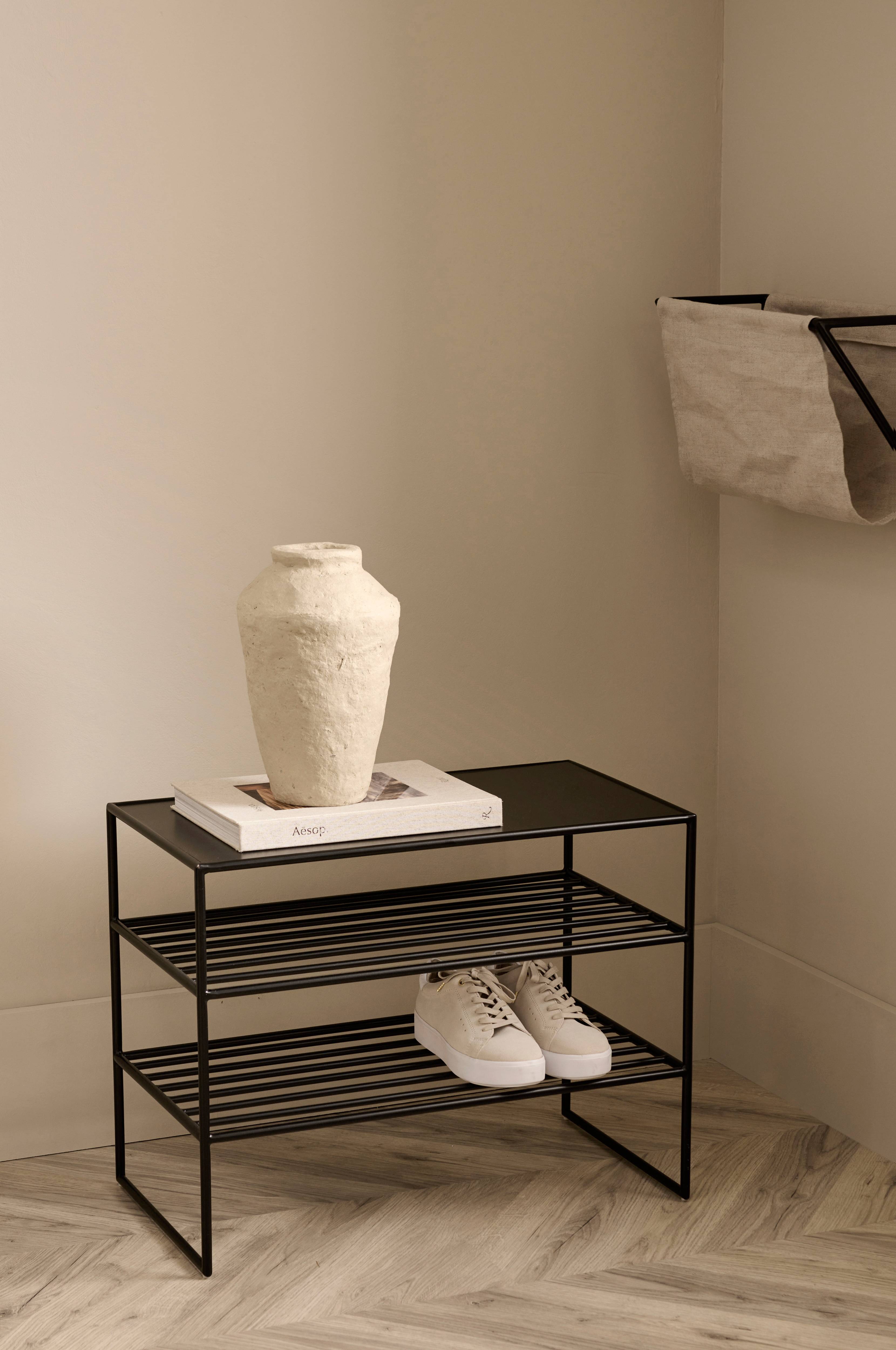 Skoreol/bænk i pulverlakeret metal. 2 hylder under toppladen. Højde mellem hylderne 14/16,5 cm. Frihøjde under hylden 17 cm. Maks. vægtbelastning på bænken 100 kg. Maks. belastning pr. hylde under bænken 50 kg.
