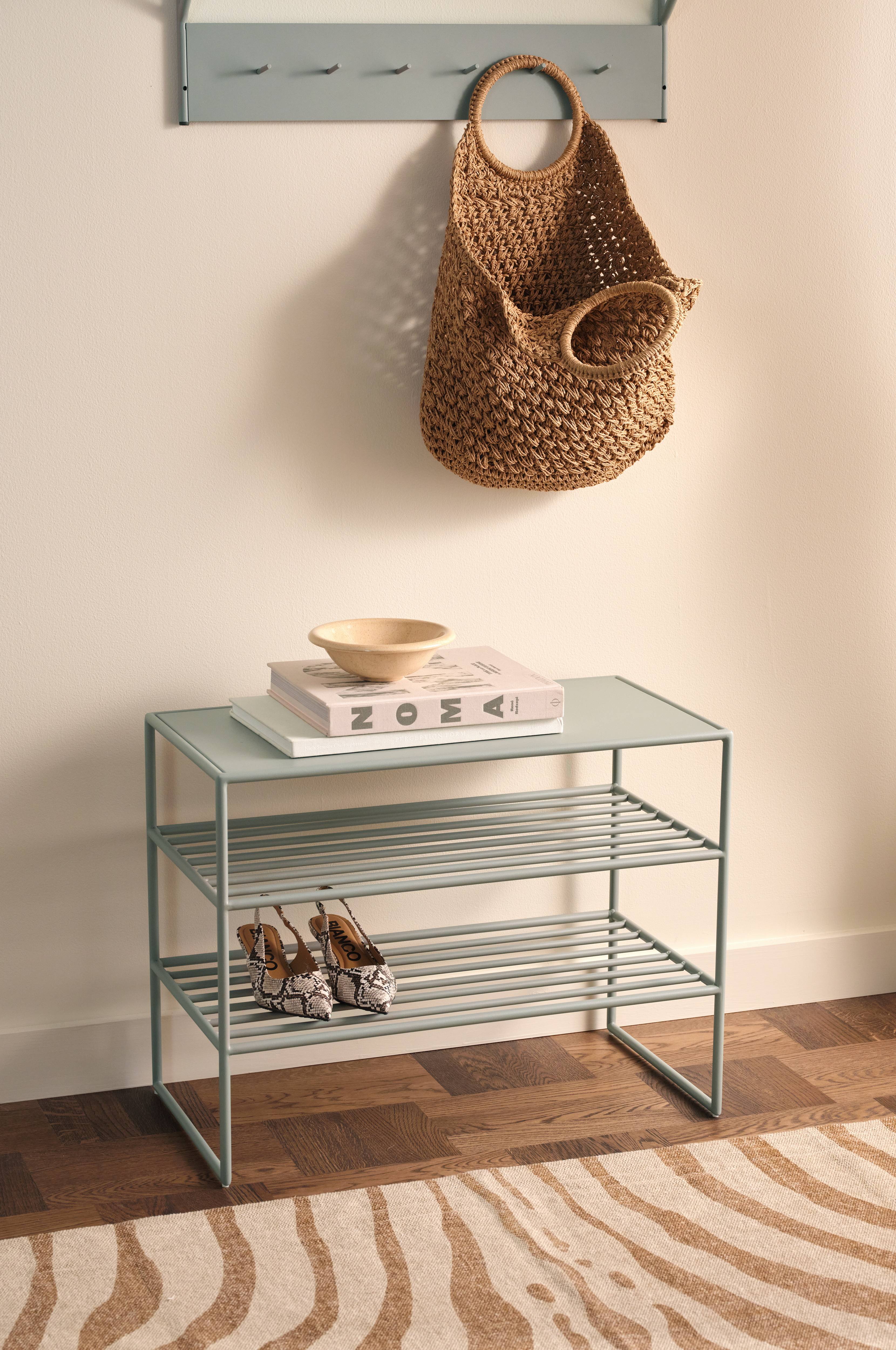 Skoreol/bænk i pulverlakeret metal. 2 hylder under toppladen. Højde mellem hylderne 14/16,5 cm. Frihøjde under hylden 17 cm. Maks. vægtbelastning på bænken 100 kg. Maks. belastning pr. hylde under bænken 50 kg.