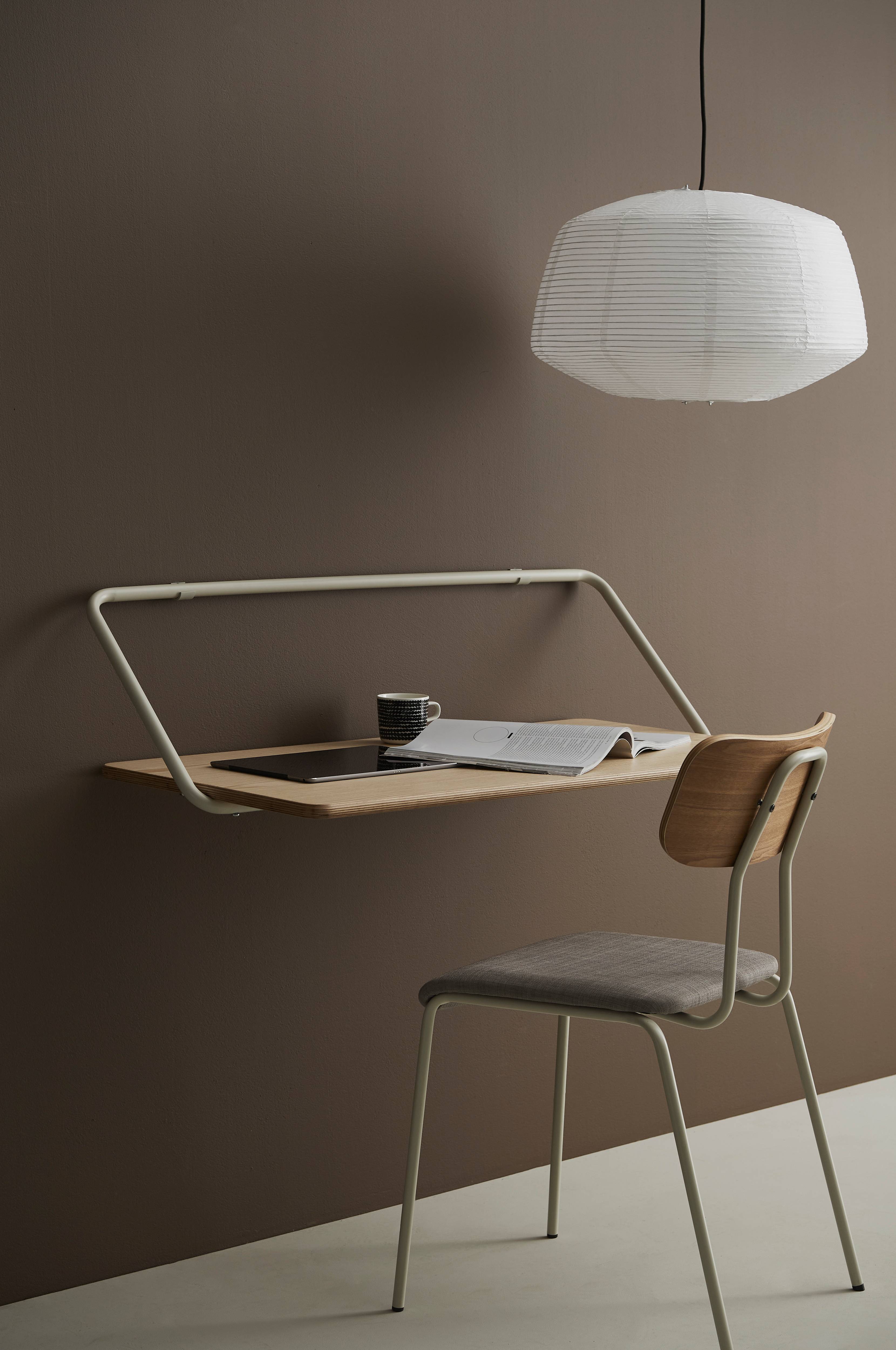 Skrivebord i plywood af høj kvalitet med askfinér som monteres på væggen. Du bestemmer selv højden og derfor fungerer dette produkt både på hjemmekontoret og på børneværelset. Bordpladen suppleres fint med de buede former på det pulverlakerede metalstativ. Skrivebordet kan ikke foldes op eller ned. Højde 29 cm, bredde 50 cm, længde 100 cm. Lettere montering.