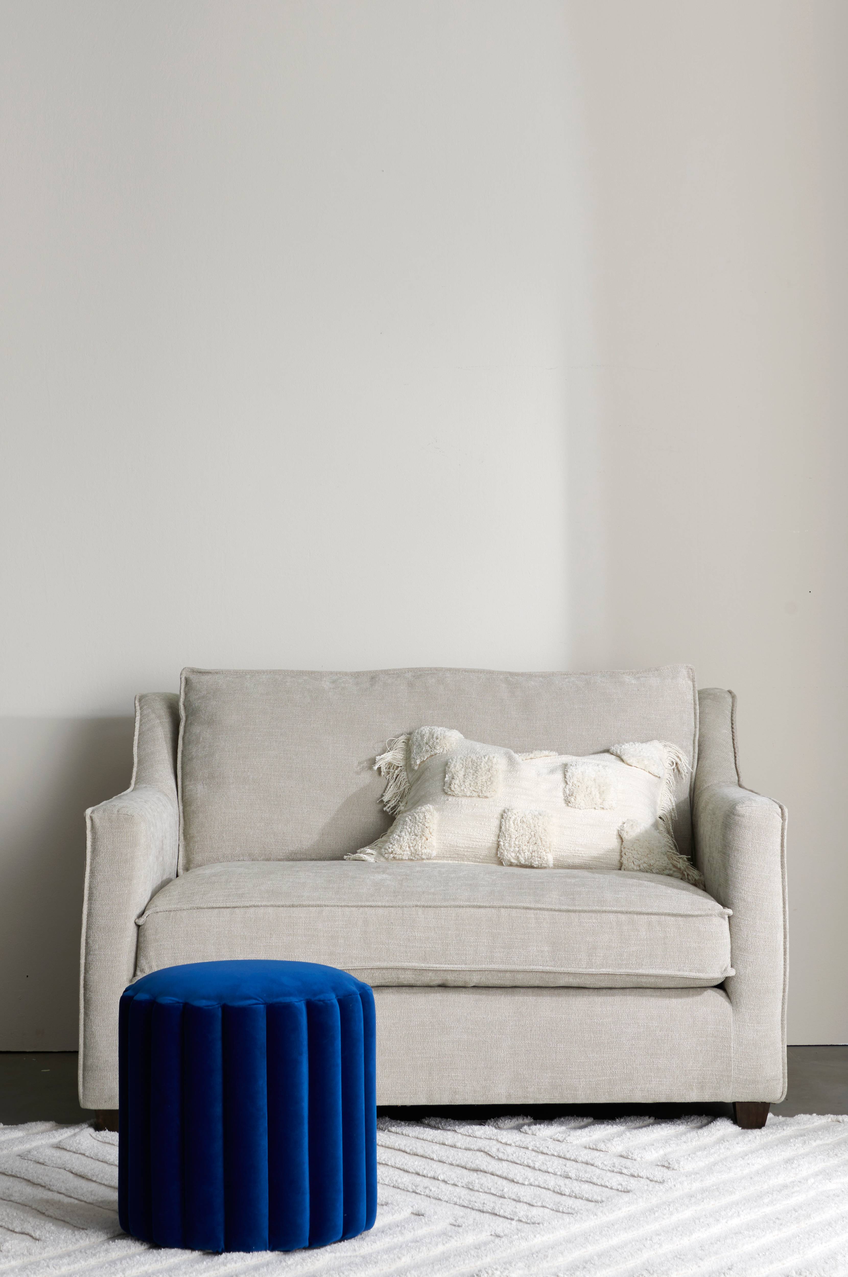 Siddepude: Plywood, massivt fyrretræ, nozag-fjedre, elastikbånd, skum, polyestervattering.