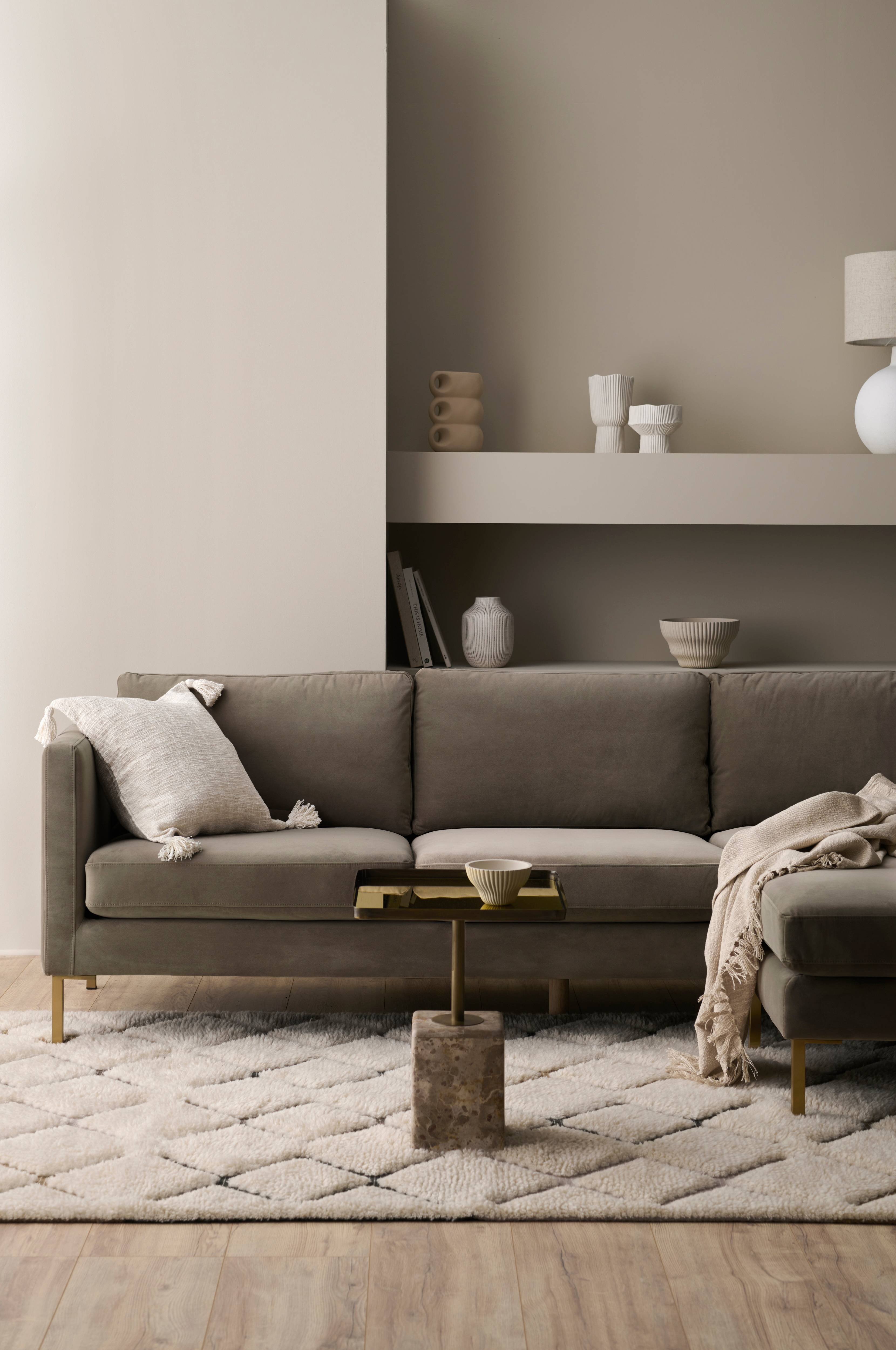 3-pers sofa i velour. Model med et moderne udtryk og en chaiselong som kan venstre- eller højremonteres. Puder og hynder er aftagelige. Betrækket er aftageligt på ryghynderne, siddehynderne og chaiselonghynden. Fast betræk på øvrige dele. Ben af metal. Totale mål: Højde 83 cm, bredde 243 cm, dybde inkl. chaiselong 154 cm, uden chaiselong 86 cm. Siddehøjde 44,5 cm, siddedybde 56 cm, siddebredde 223 cm. Højde fra gulv til armlæn 72 cm. Frihøjde under møbel (benhøjde) 16 cm. Chaiselongen og benene leveres usamlede. Martindale > 40000.