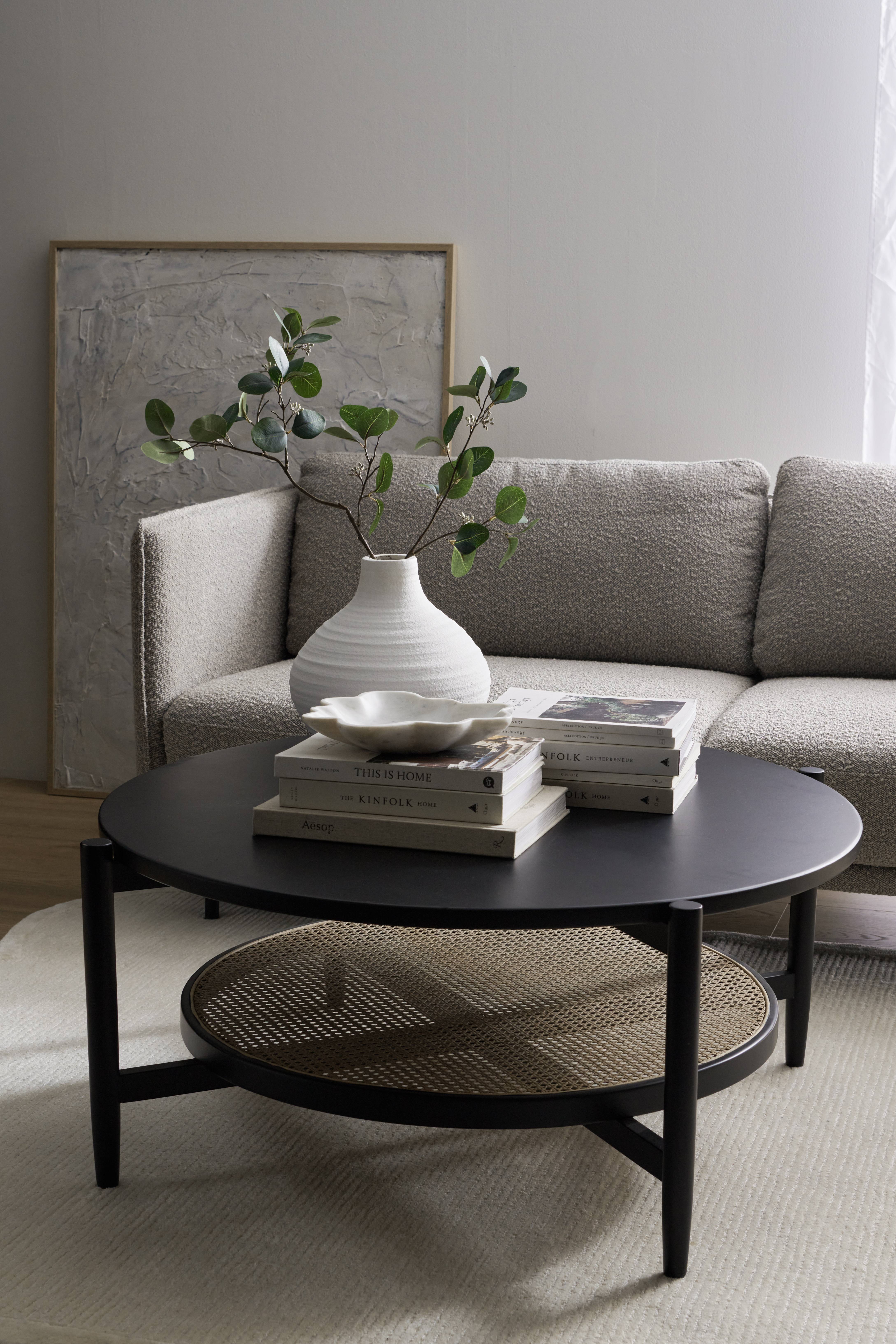 Rundt sofabord med en hylde i rottingflet. Ben af massiv bøg og bordplade i bøgefineret MDF. Mål: Højde 45 cm, Ø 108 cm. Hylde: Ø 80 cm. Højde fra gulvet til hylde 12 cm. Højde mellem hylde og bordplade 19,5 cm.
