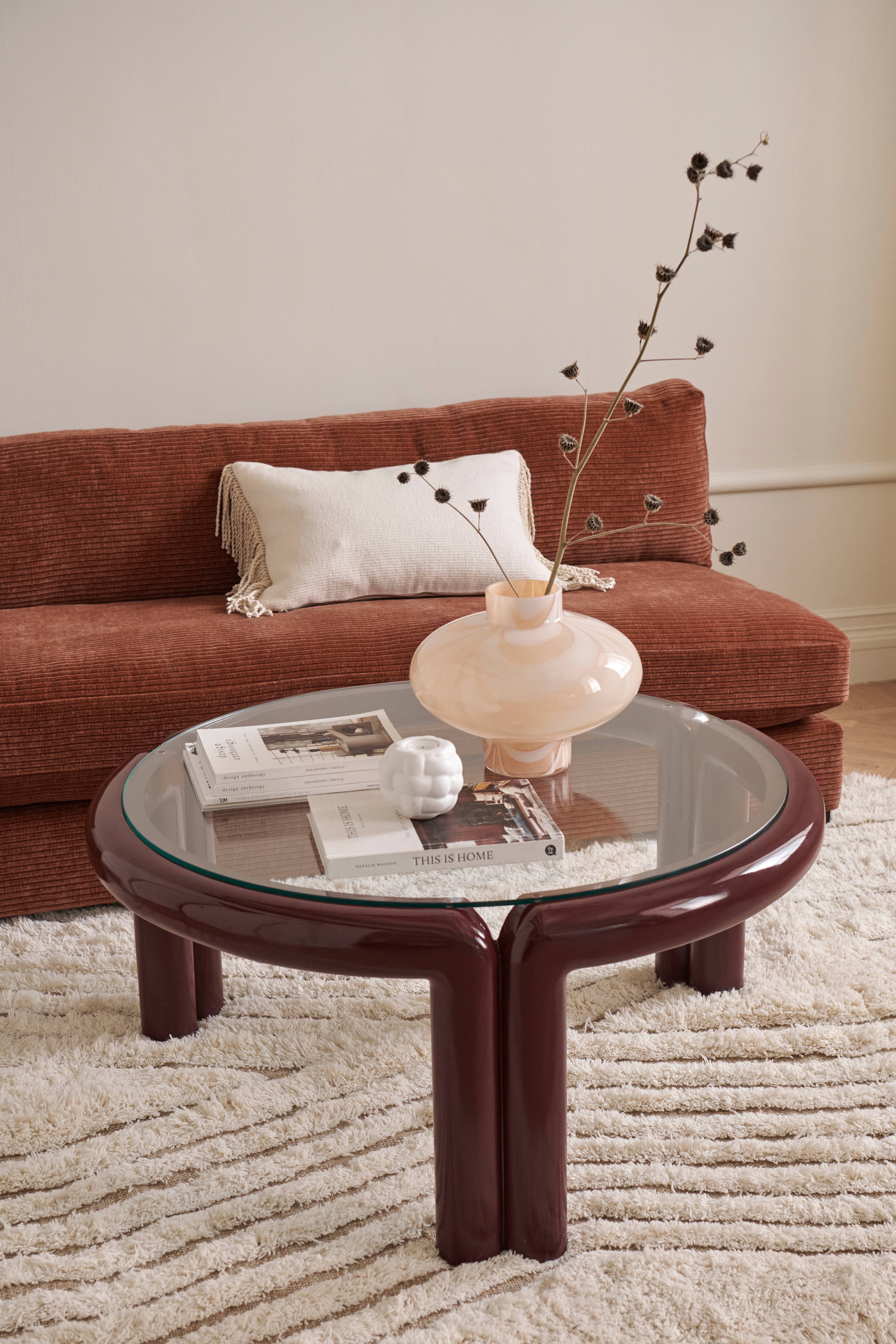 • Rundt sofabord i skinnende, lakeret MDF• Hærdet bordplade i glas• Topskivens tykkelse: 8 mm• Maks. vægt: 20 kg