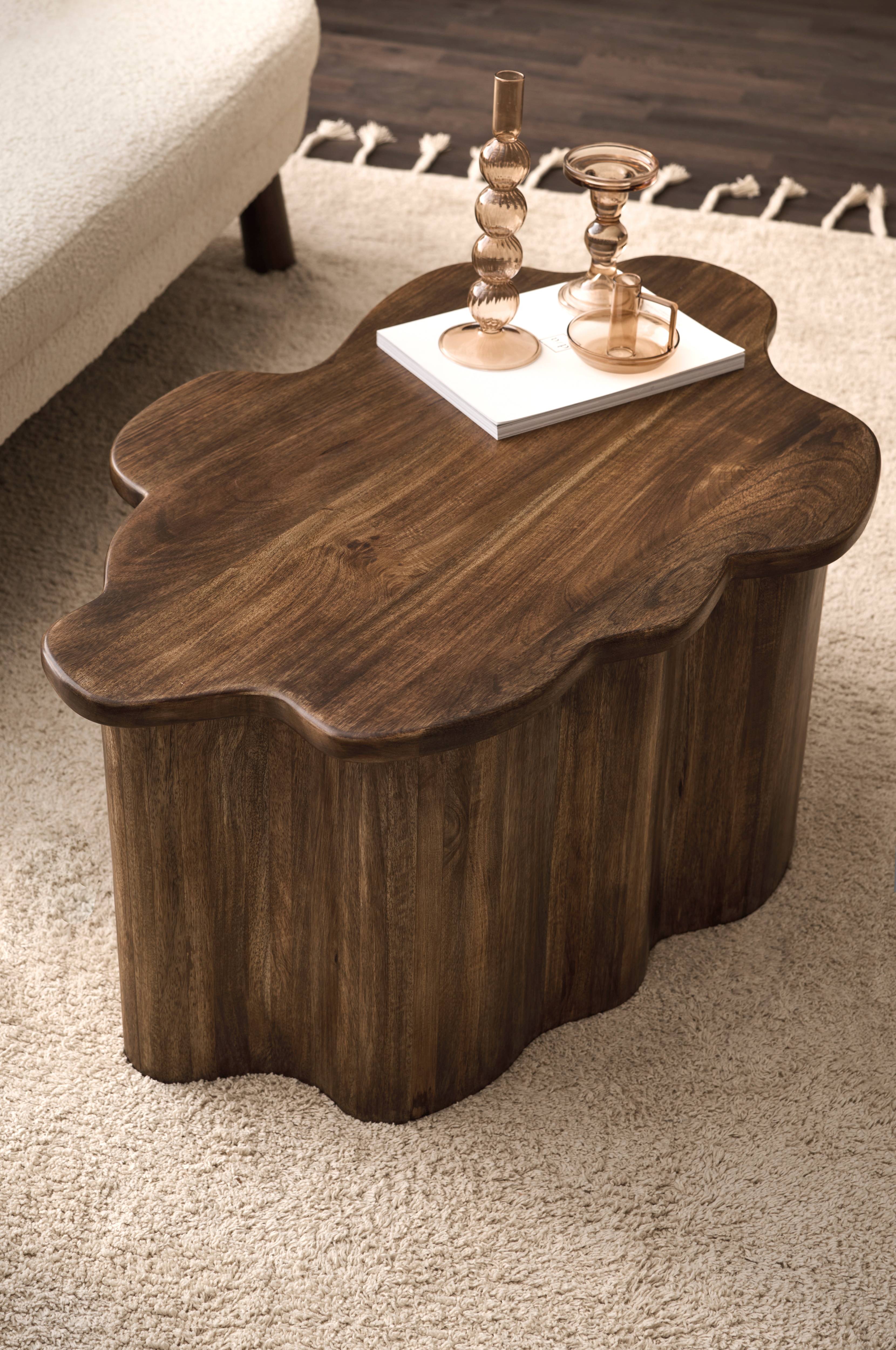 Sofabord med blød, organisk form. Af mangotræ med vokset finish. Skjult metalstel. Maks. vægt 50 kg. Leveres samlet.