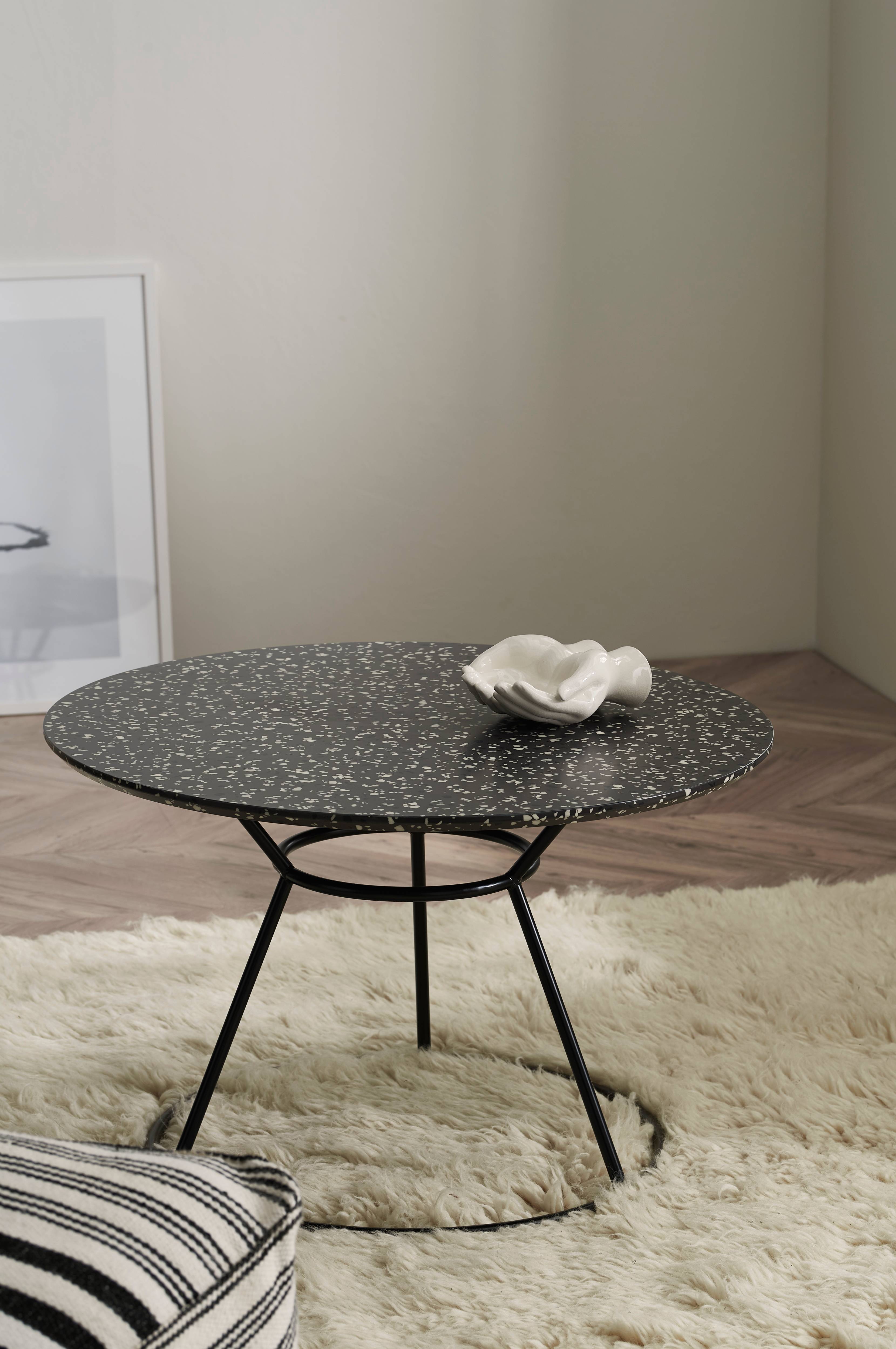 Sofabord med bordplade af MDF beklædt med terrazzo-folie. Understel af metal. Diameter på bordpladen er 80 cm. Diameter forneden 60 cm. Lettere samling.