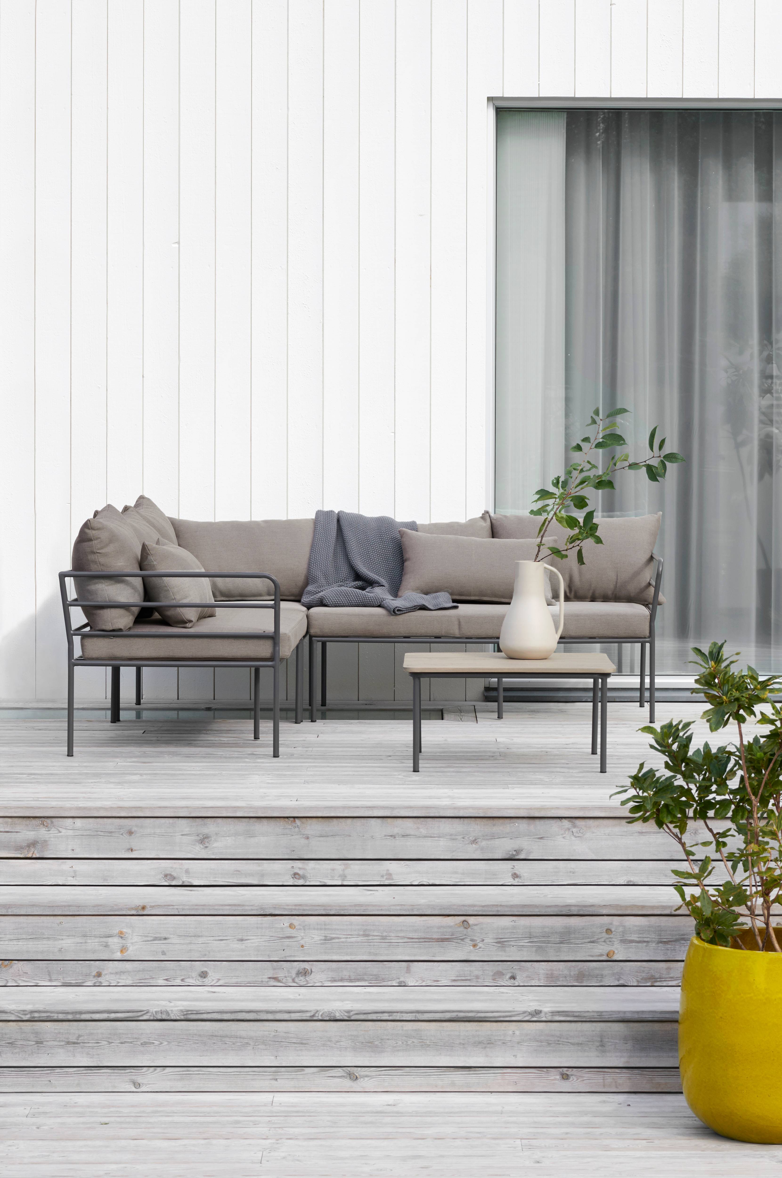 Sofa i loungemodel med et sofabord. Sofaen består af to 2-pers. moduler og et hjørnemodul som sættes ved siden af hinanden eller fastgøres sammen (beslag medfølger ikke).