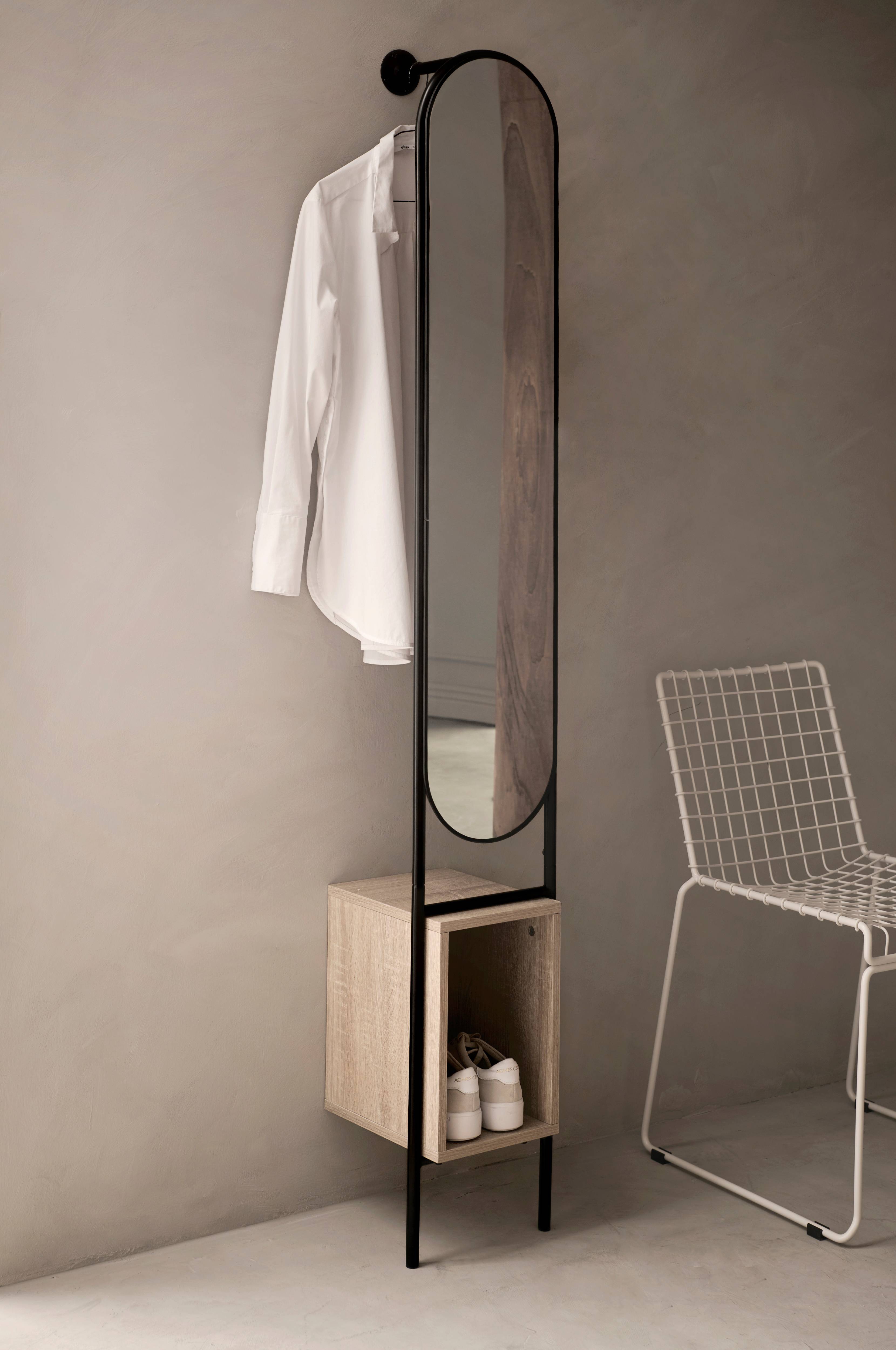 Spejl med stang af metal til bøjler på bagsiden. Ramme og stang af pulverlakeret metal Opbevaringshylde i fineret MDF. Samlede mål: B 27 x H 180 x D 27 cm. Opbevaringskassens mål: B 23 x H 34 x D 27 cm. Indv. mål 19x31 cm. Leveres usamlet.