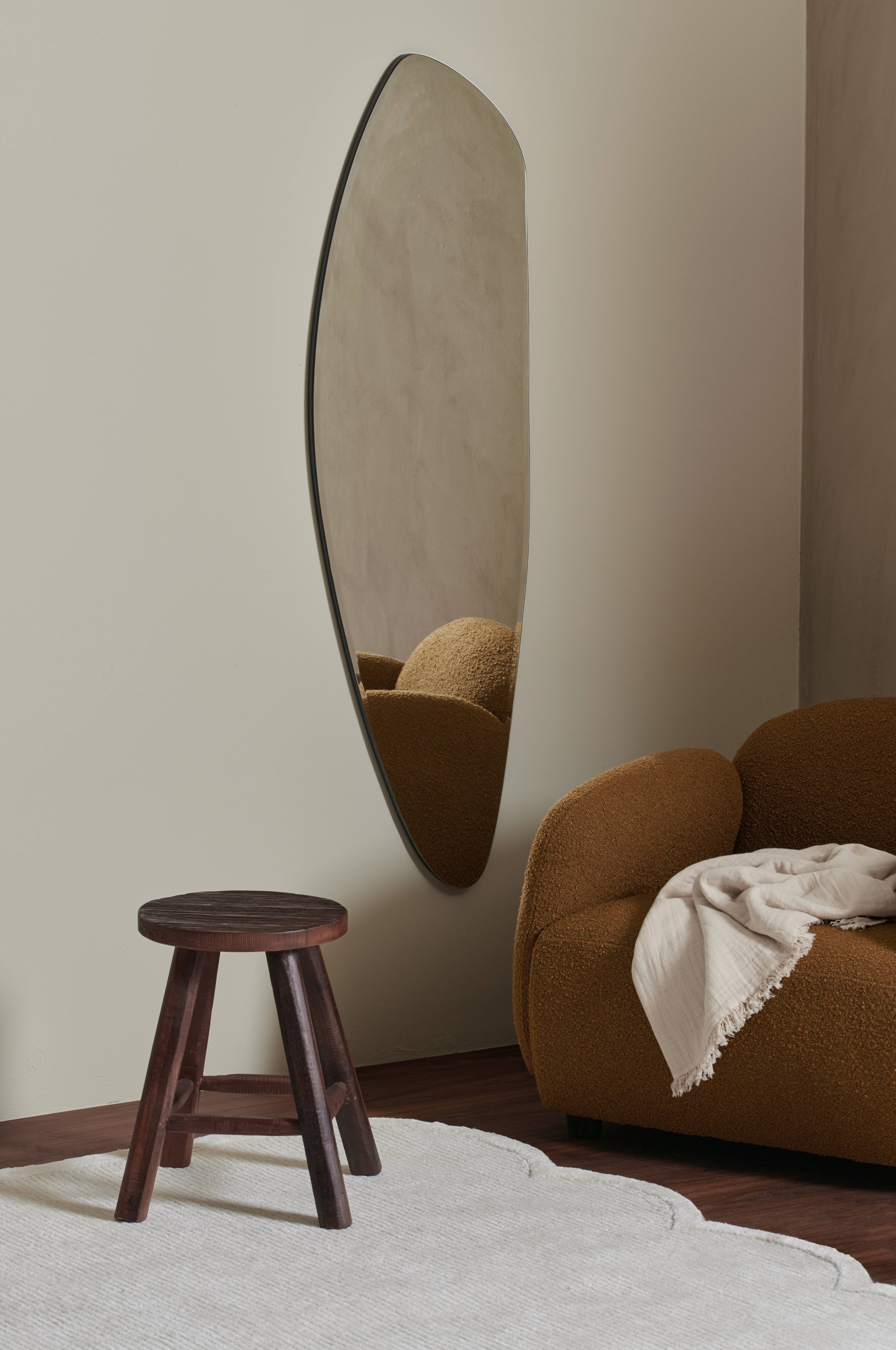 Spejl med uregelmæssig, organisk form og faset kant rundt om. Til vægophængning. Bagside i MDF. Spejlet kan hænges med enten den smallere eller bredere side opad.