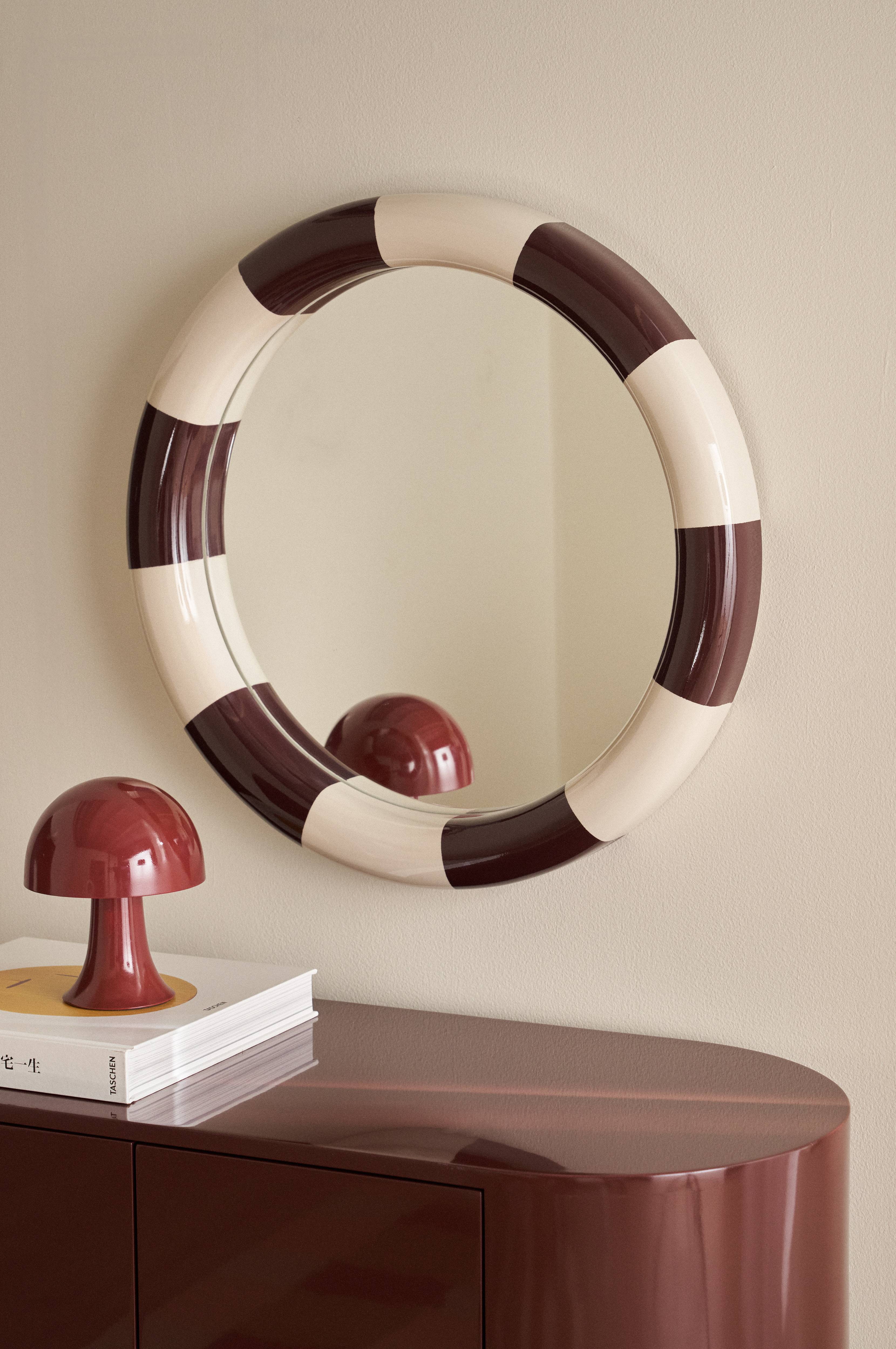 • Rundt spejl med ramme i patent, skinnende MDF• Bagside i MDF• Diameter på spejloverflade: 47 cm• Metalklips på bagsiden til ophængning