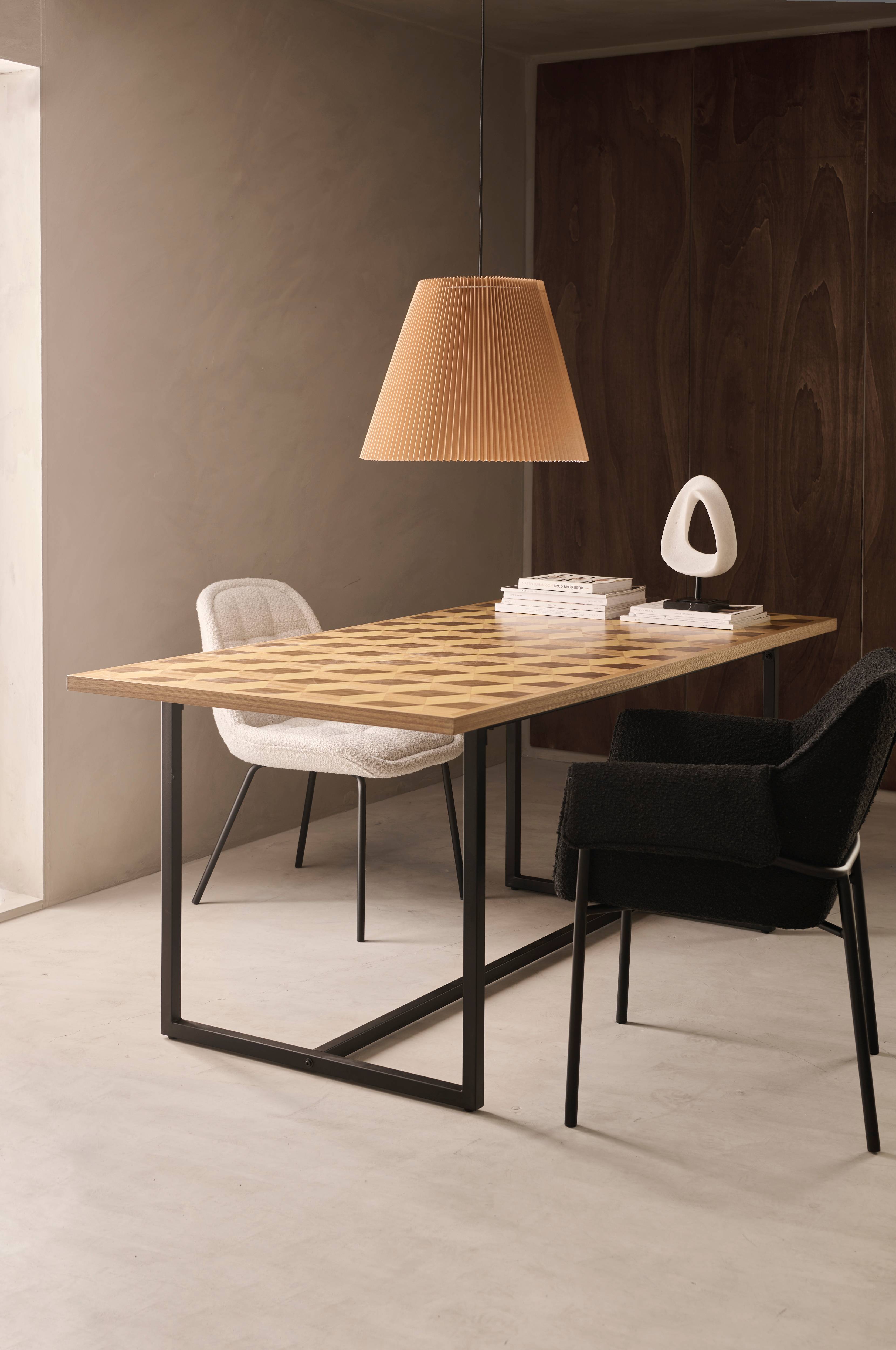Spisebord med understel i pulverlakeret metal. Bordplade i MDF med geometrisk mønster i forskellige nuancer. Lev. usamlet.