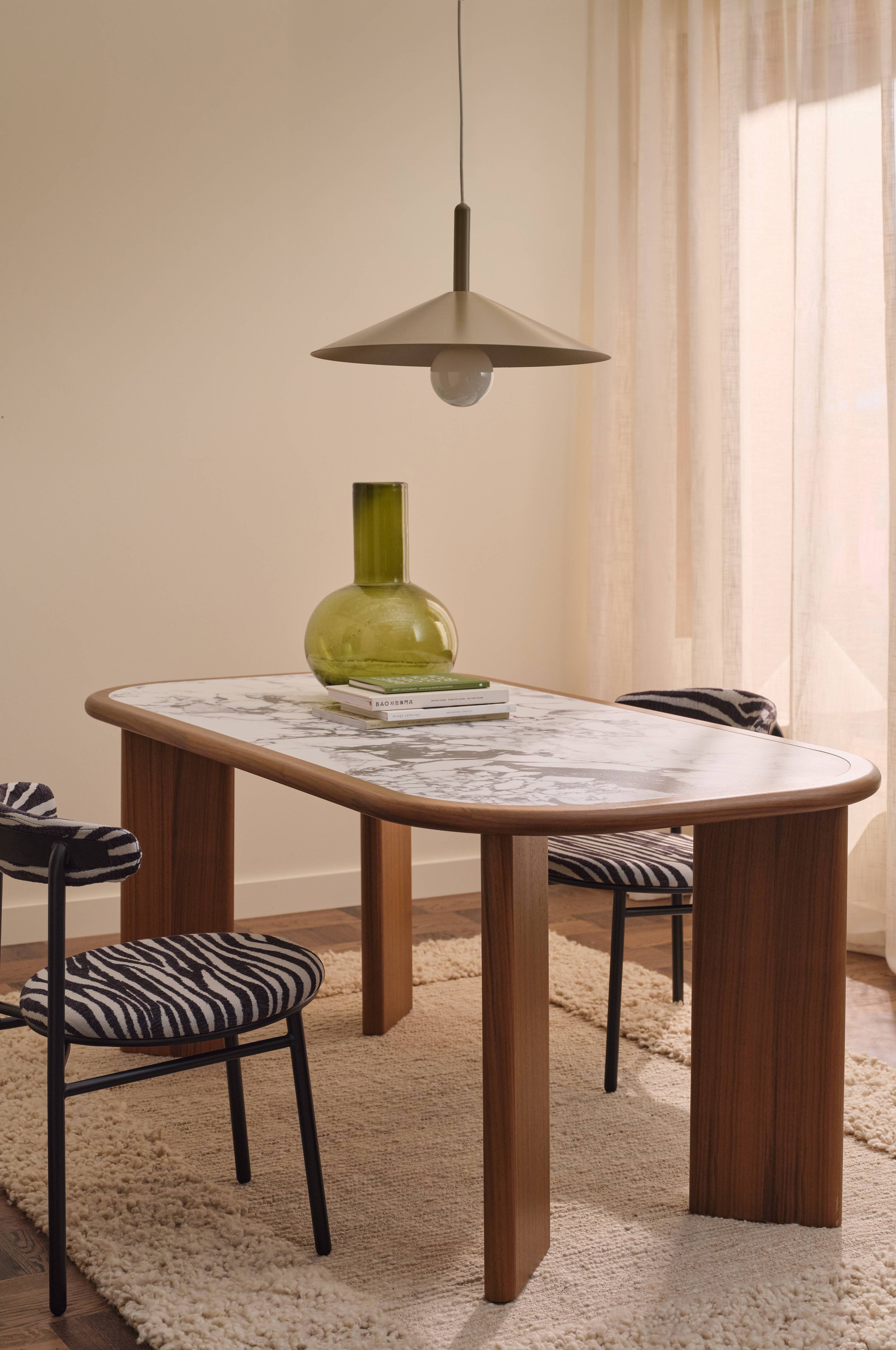 • Spisebord med bordplade i MDF med en skive i Kompositsten• Ben i fineret MDF• Afstand mellem benene på den lange side: 117 cm
