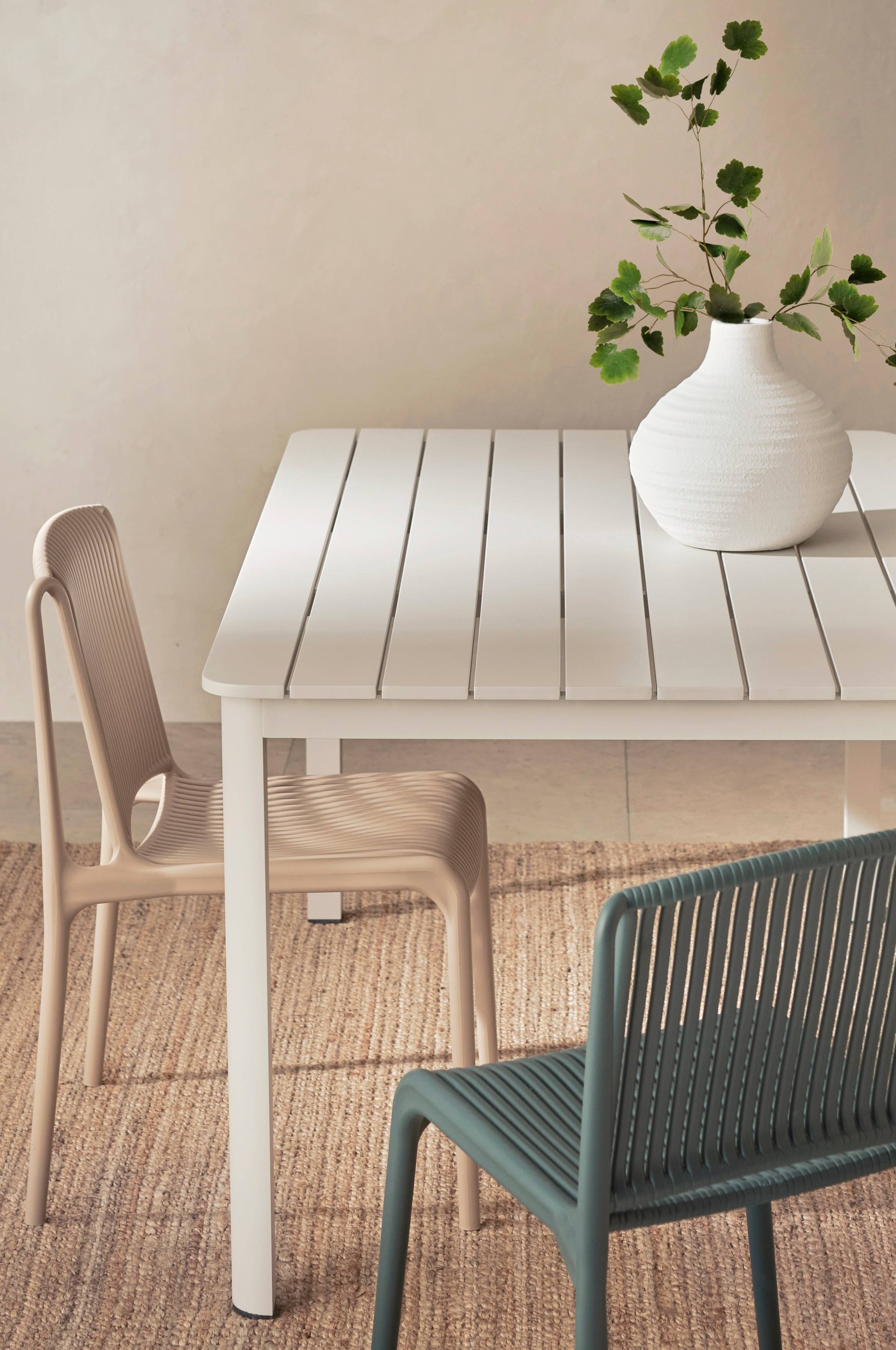 Spisebord i aluminium med rillet bordplade. Kan bruges udendørs.