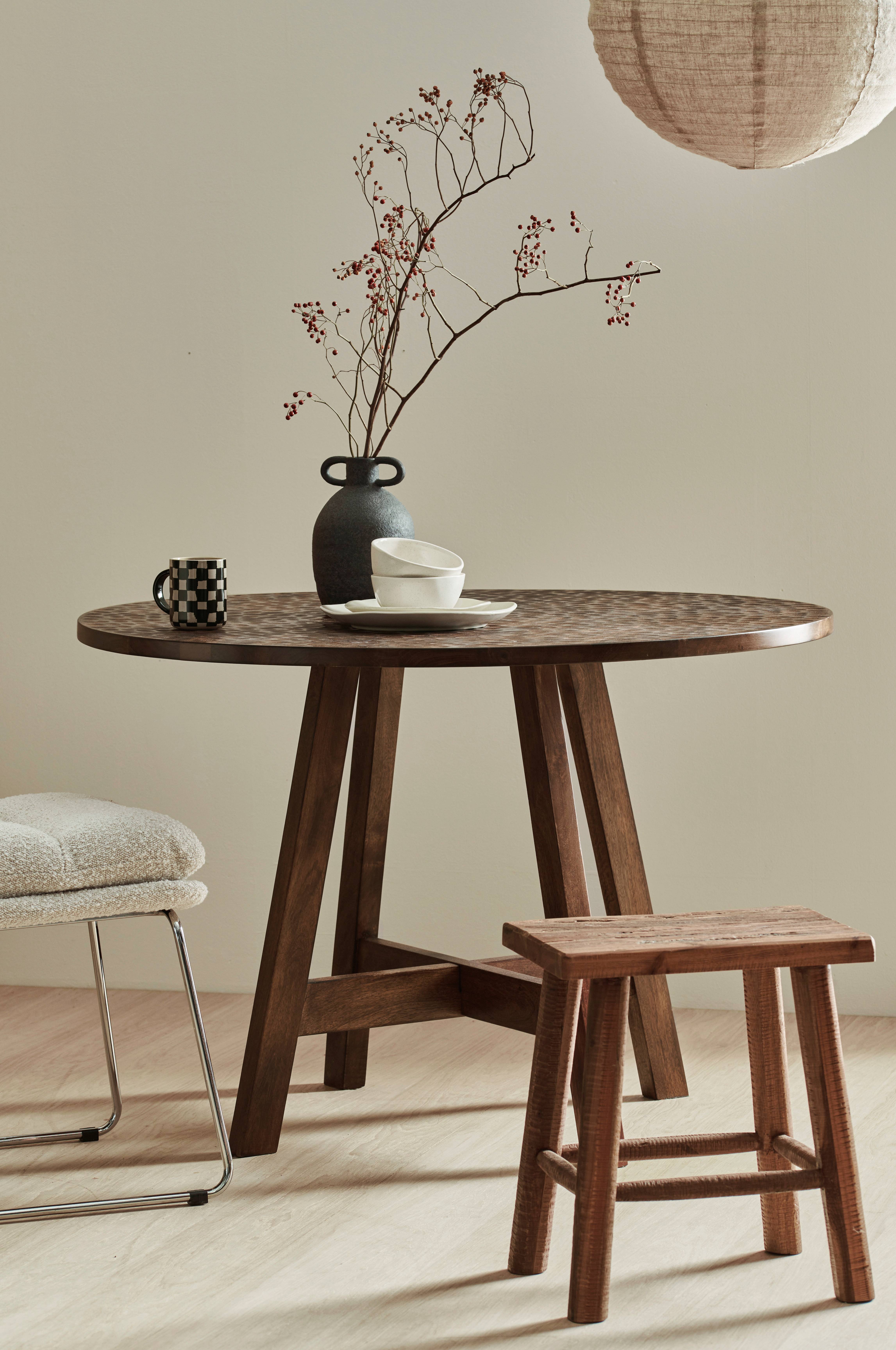 Rundt spisebord i mangotræ med vokset overflade og et dekorativt, udskåret mønster på bordpladen.