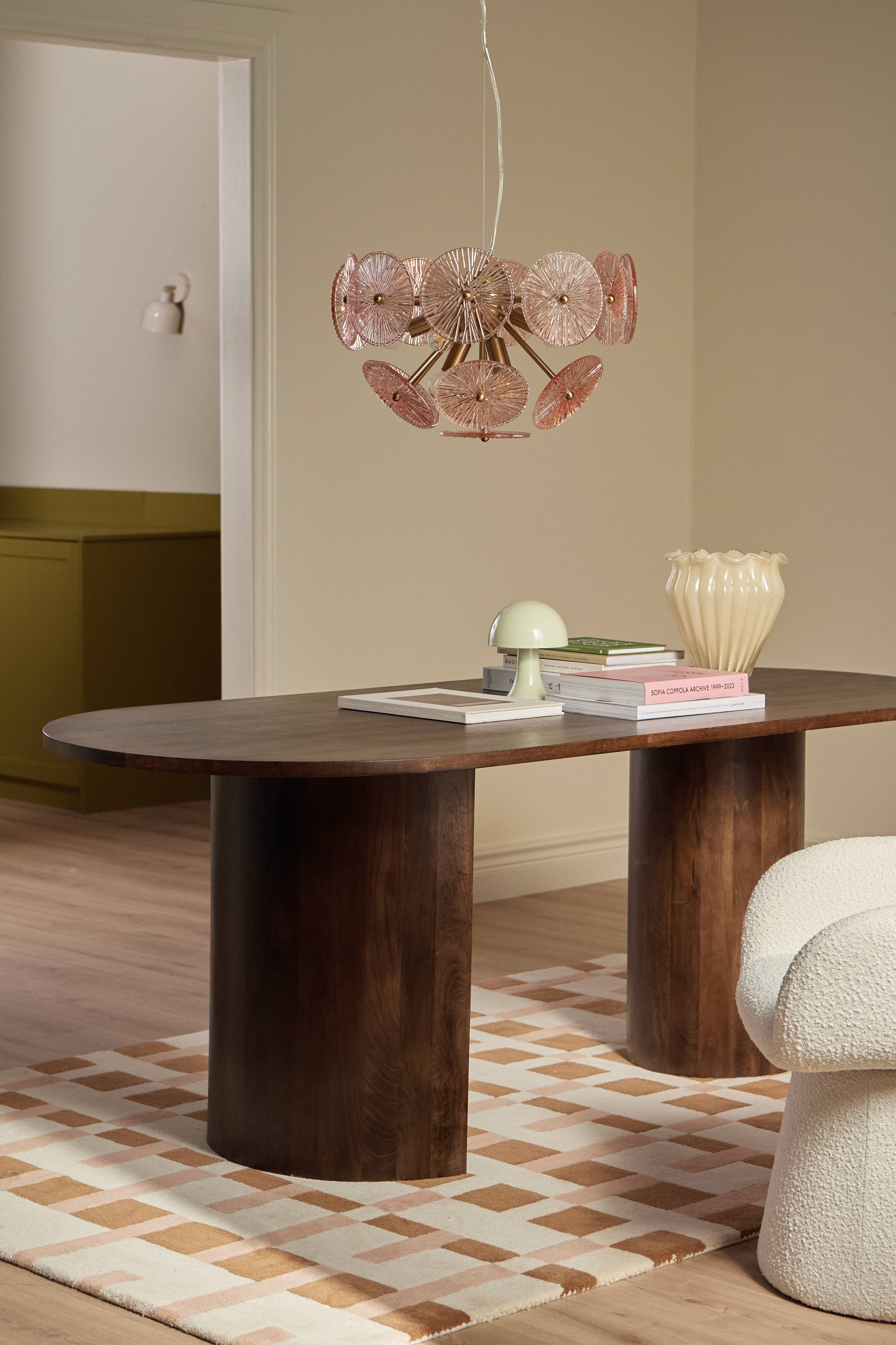• Ovalt spisebord i mangotræ med vokset afslutning• Et rundt, kraftigt ben• Et halvmåneformet ben• Afstand mellem bordben: 77 cm• Maks. vægt: 120 kg