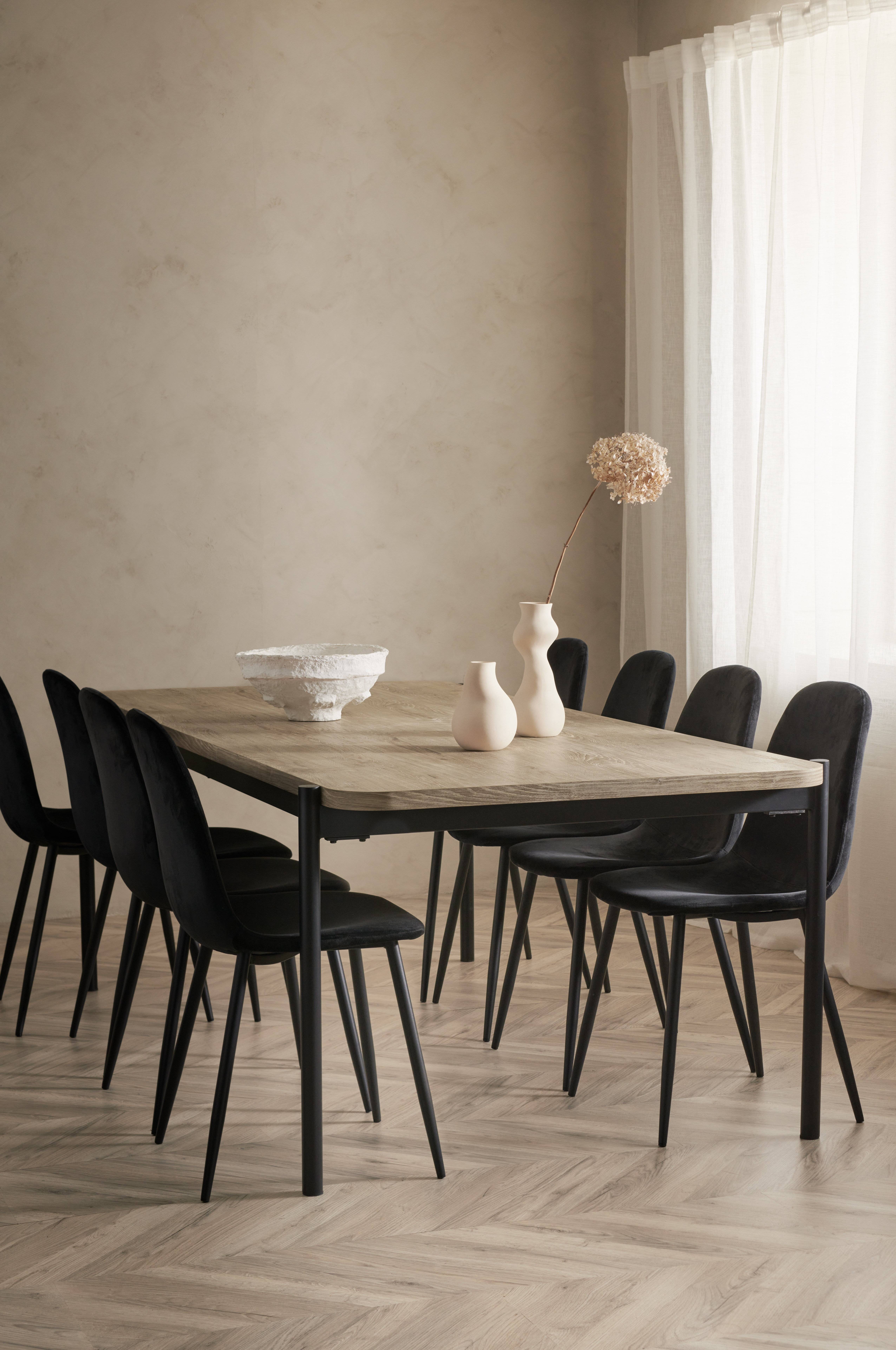 Spisegruppe med bord og otte stole. Bordet har pulverlakerede metalben og en plade i folieret MDF.