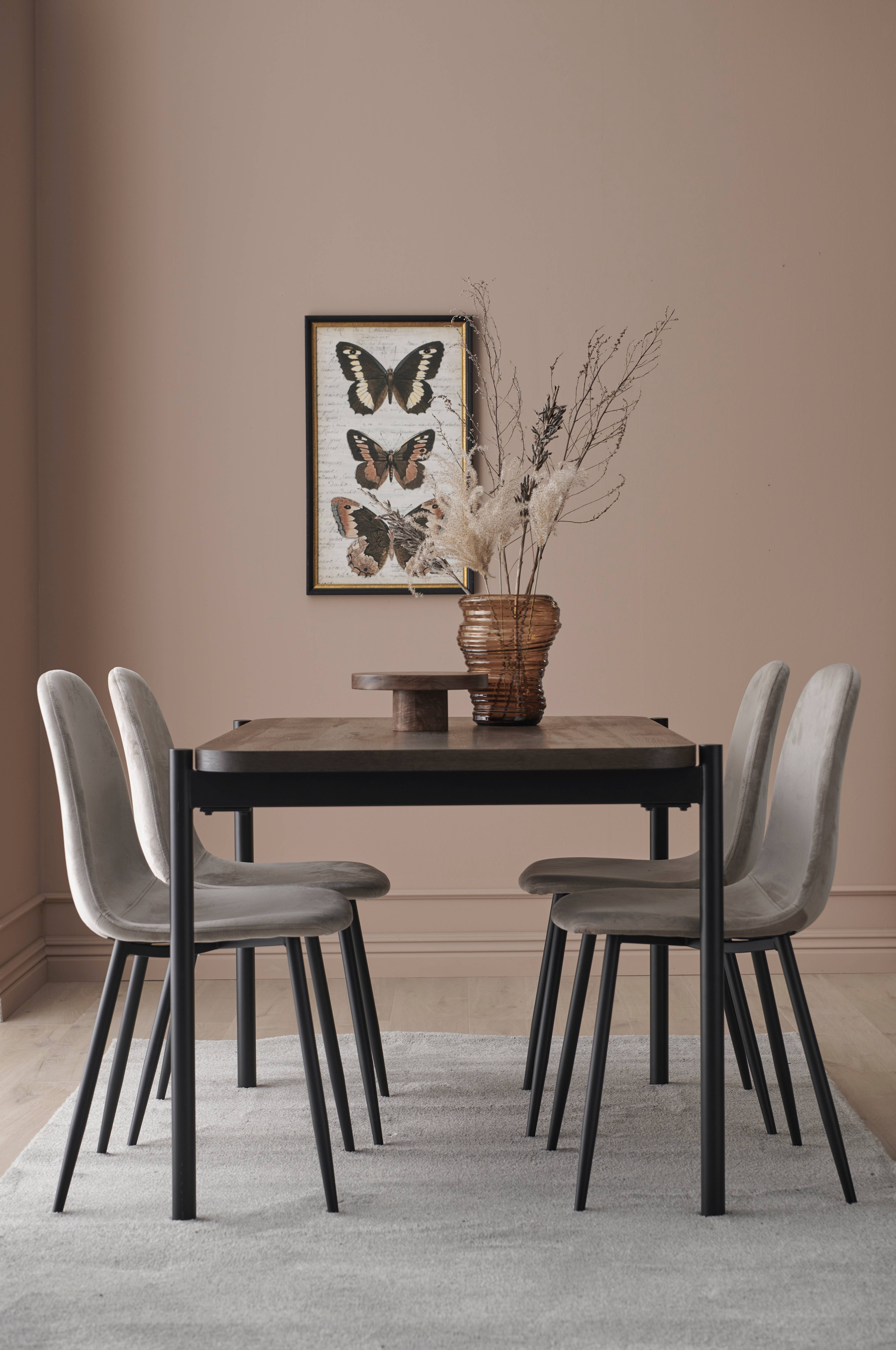 Spisegruppe med et bord og fire stole. Bordet har pulverlakerede metalben og en plade i folieret MDF. Stole med pulverlakerede metalben. Sæde med fløjlspolstring og skumfyld.