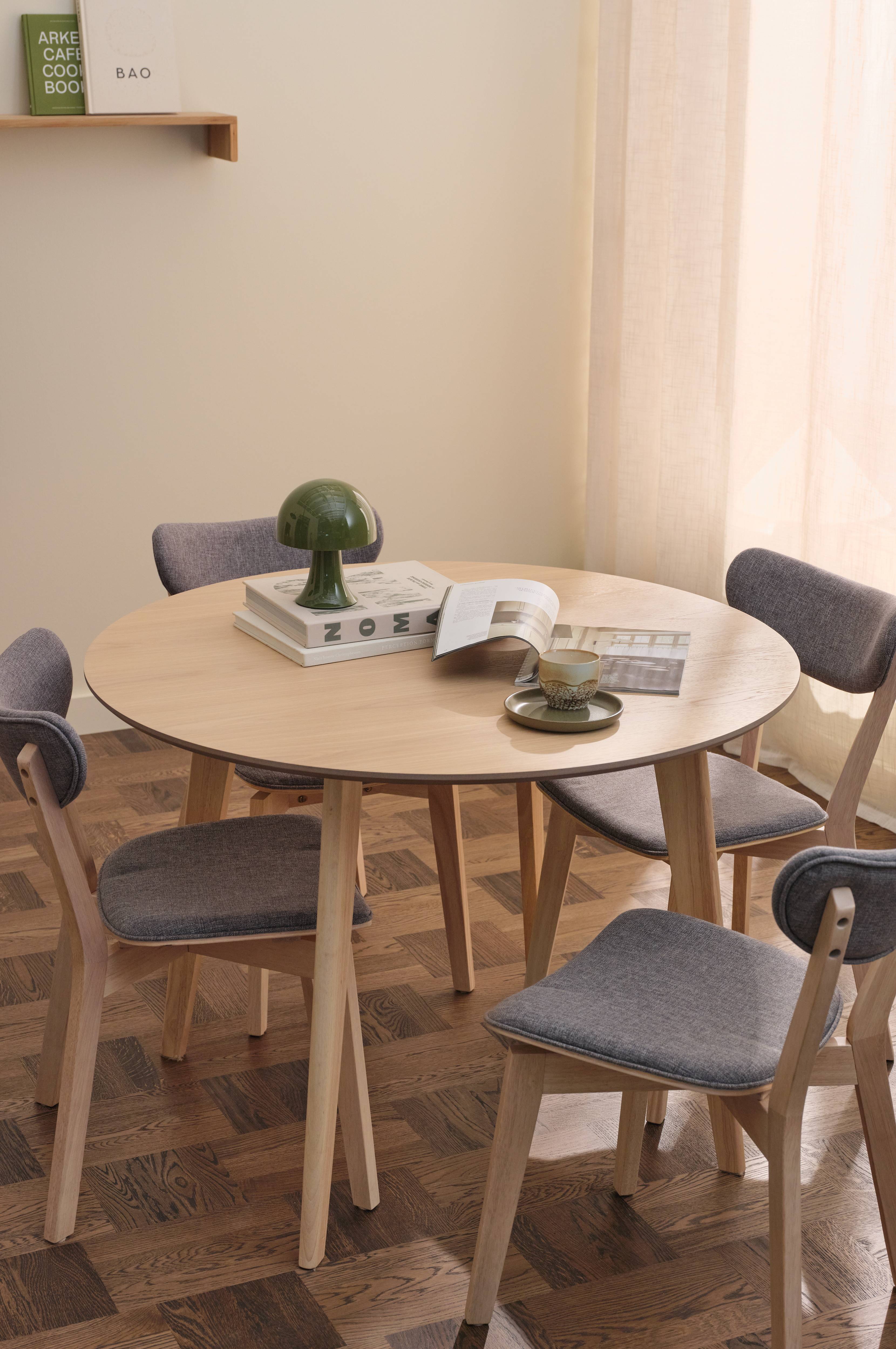 • Spisebordssæt i egetræsfinér Gummitræ med patent afslutning • Rundt bord med bordplade i egetræsfinér MDF • Fire stole med polstring i polyester • Skumfyld • Mål på bordet: Diameter 105 cm Højde 76 cm • Mål på stolen: Højde: 79 cm Bredde: 45 cm Dybde: 50 cm Sædehøjde: 44 cm Sædebredde 41 cm Sædets dybde: 37 cm
