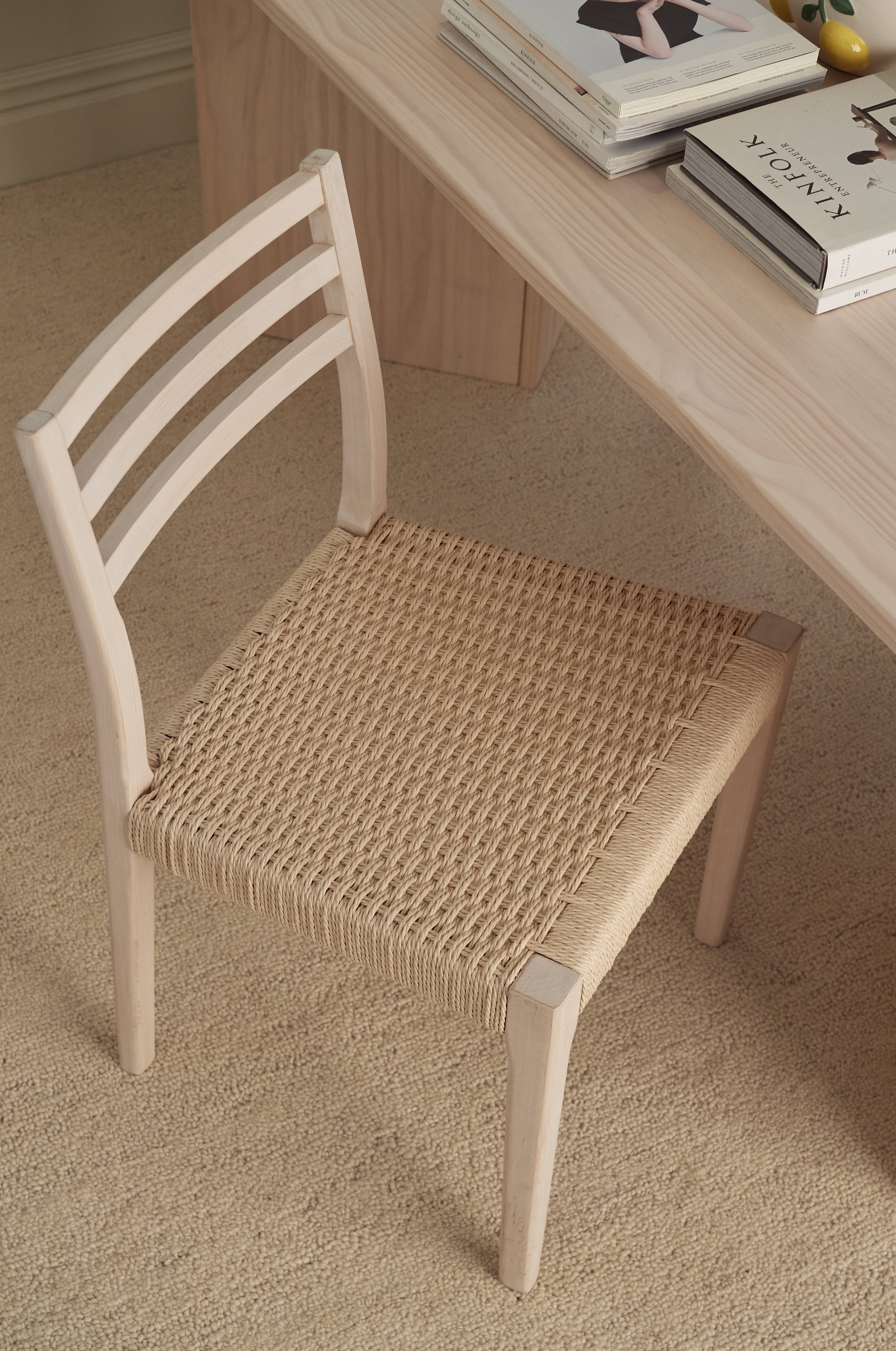 To stole af birk i skandinavisk stil med sæde af flettet, vokset papirsreb. Totale mål: 79,5 x 50 x 49 cm. Siddehøjde 45 cm, siddedybde 45 cm. Samlet. Maks. vægt 90 kg.